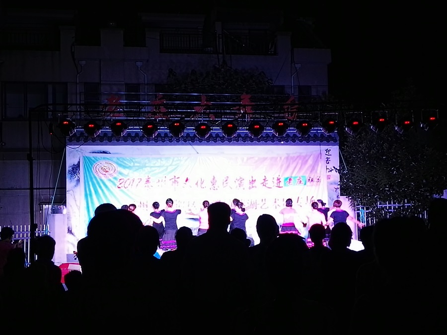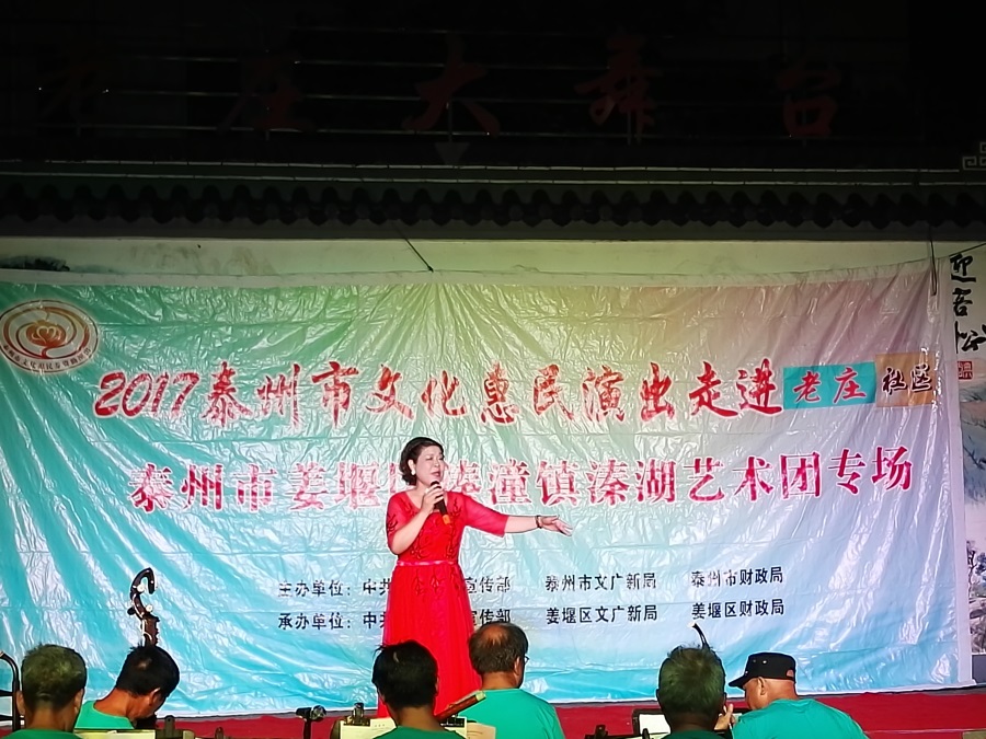 9月8日,秋高气爽姜堰区溱潼镇溱湖艺术团应姜堰镇老庄社区邀请,2017年泰州市文化惠民券专场演出于当晚7点三十分,在社区百姓大舞台上演。为适应观众不同层次的文化欣赏需求,溱湖艺术团精心策划了13个丰富多彩的文艺节目,随着欢快喜庆的音乐响起,舞蹈《红红火火大中华》拉开了演出序幕,当晚演出不仅有激情奔放的民歌与民舞,而且有耳熟能详的戏曲,淮剧《手捧枝头花香藕》,还缴请当地群众上台表演,最后在歌伴舞《阳光路上》结束晚会,整台演出效果好,弘扬社会正气,倡导诚实守信,气氛热烈,掌声不断,赢得了广大观众的一致好评。当天晚上演出时长90分钟,观众达到300多人,优美而精彩的表演,给居民送去一份丰盛的文化大餐。