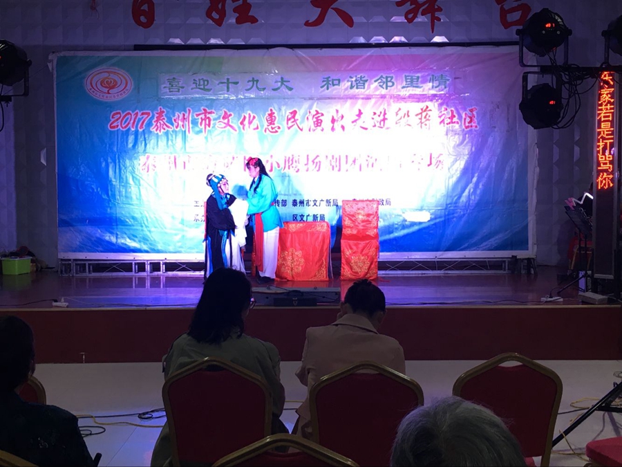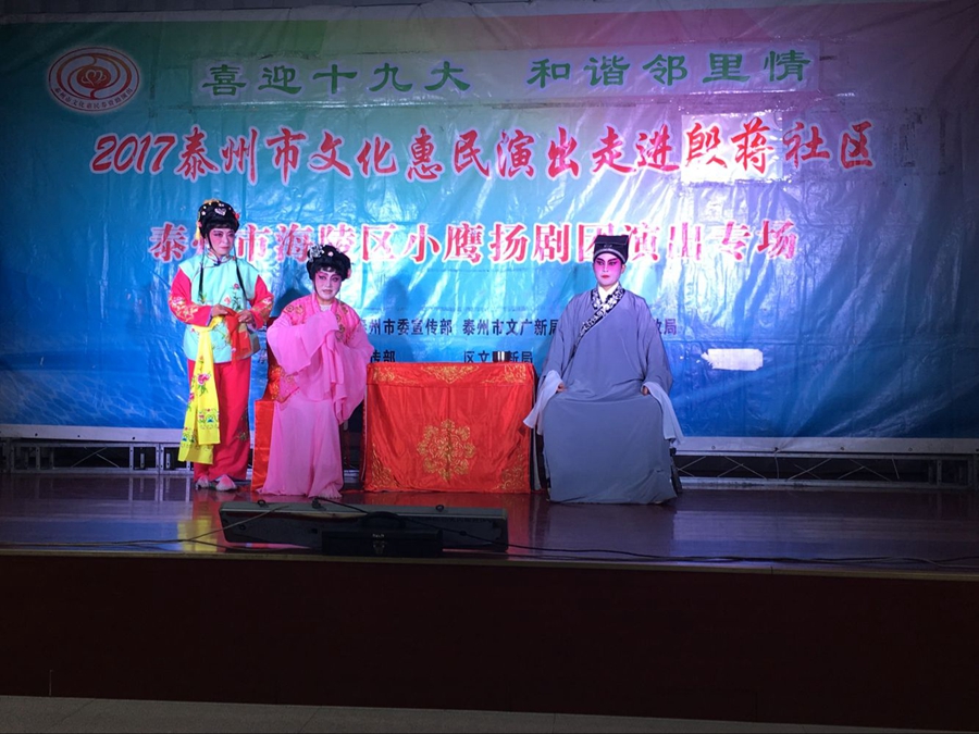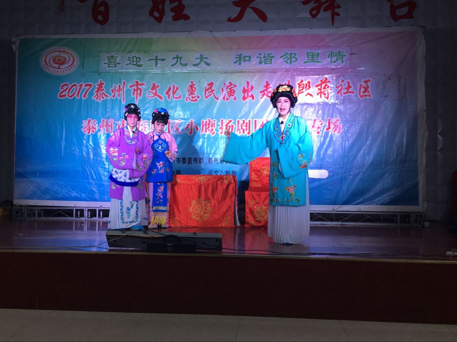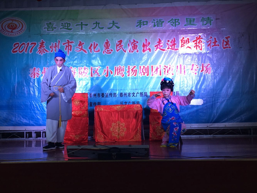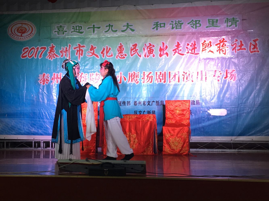 2017年9月6日晚上,海陵区小鹰扬剧团文化惠民演出走进凤凰街道殷蒋社区,演出在殷蒋社区百姓大舞台成功举办。扬剧安寿宝卖身选段的母子分别,唱出了安寿宝矛盾的心声,七岁卖身卖了12两纹银,让妈妈去药铺抓药为父亲治病,不卖一家要活活的饿死在破庙里,把自己卖了从此母子天涯分别,精彩的演出催人泪下,赢得了观众的阵阵掌声。小媳妇回娘家反映了封建的家庭传统模式,后来通过二亲家的唇枪舌战,终于使蛮横的婆婆思想转变,一家人过上了平等的互助的和谐生活,剧情曲折感人,老百姓看了评价很好。演出很成功!感谢社区领导提供全方位的服务!