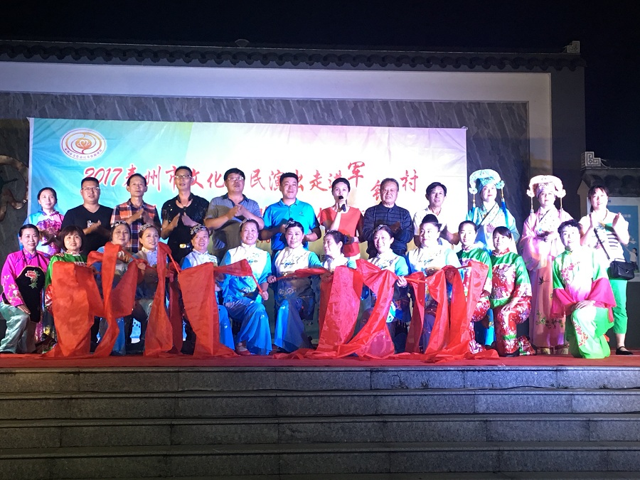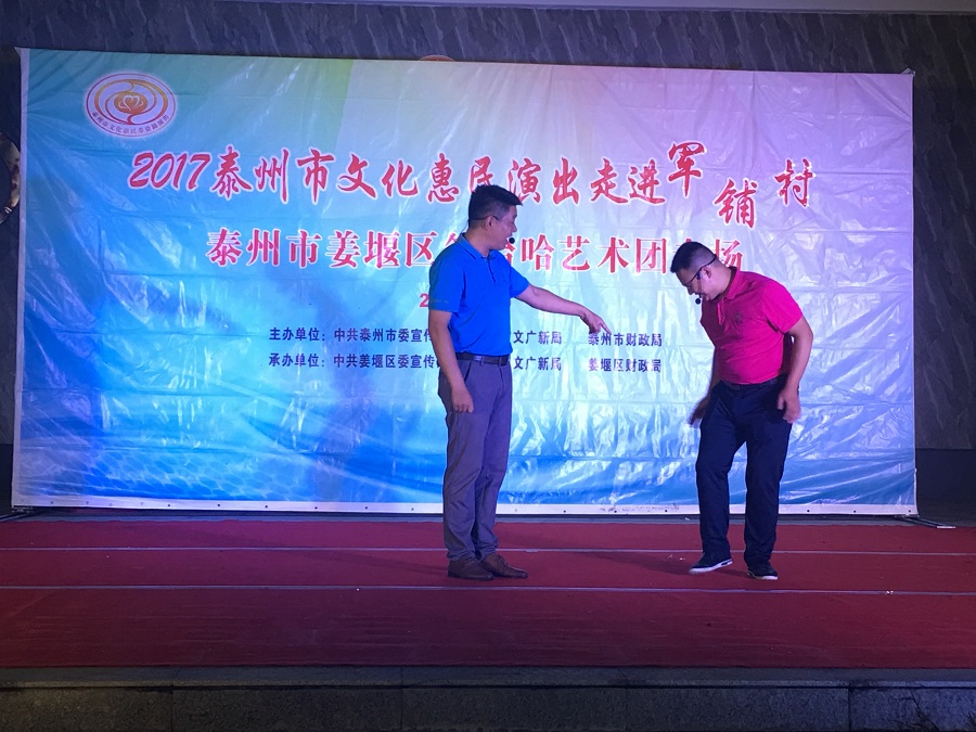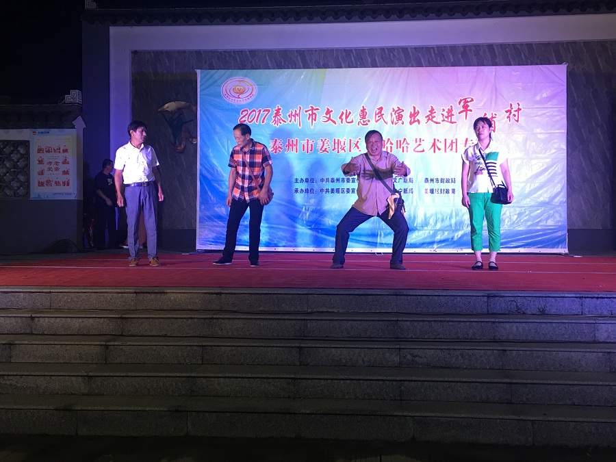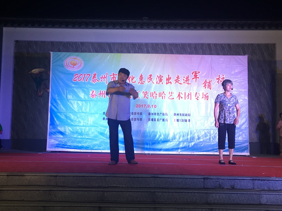 9月10日,姜堰区笑哈哈艺术团文化惠民专场演出走进三水街道军铺村。晚上7点演出在军铺村大舞台准时开始,现场表演的节目有舞蹈《红红火火大中华》、莲花落说唱《莲花一打笑哈哈》、方言韵白《洗澡》《拐过弯来是幸福》萨克斯演奏《北国之春》、表演《回娘家》、天津快板《有话好好说》、相声《趣说泰州话》、表演唱《财政惠民乐农家》、以及独唱等11种形式、12个节目。整台演出时长115分钟,观众约800人左右。节目形式多样、内容丰富,尤其相声、快板、喜剧小品、方言韵白等语言类特色节目赢得了观众的阵阵笑声和掌声,受到村干部、群众的一致好评。
