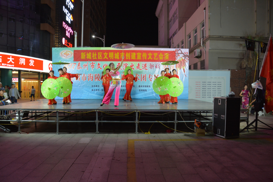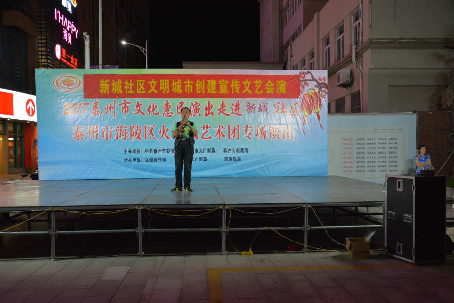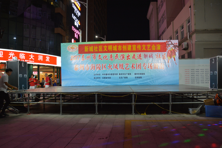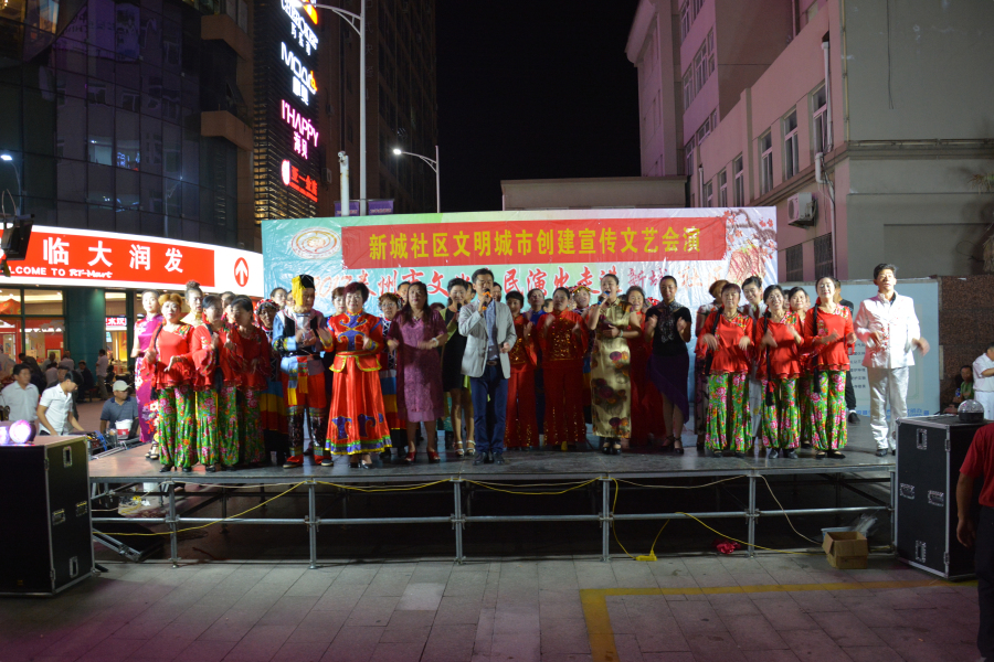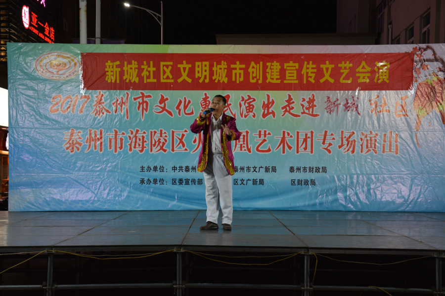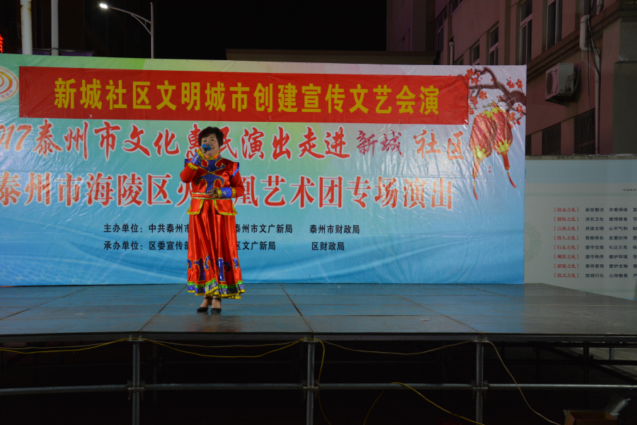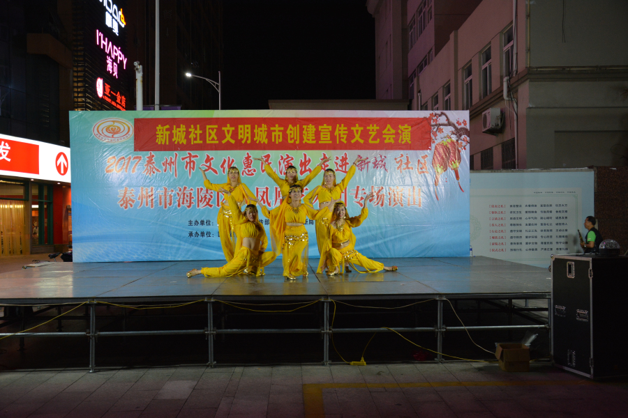 应高港区口岸街道新城社区邀请,傍晚17时,火凤凰艺术团文化惠民演出队员准时从四面八方集结至柳园西停车场,大家井然有序乘上大巴车,行驰30多公里赶到演出现场后,团员们一下车就立即开始化妆、走台、对词。这是一个美丽的社区,成立于2004年10月。辖区东至扬子江南路,西至金港中路,南至通扬路,北至通港路,面积约0.98平方公里,有12个居民小区,住户近2300户,人口近7000人,是高港区人民政府所在地。先后荣获“全国敬老模范社区”、“江苏省和谐示范社区”、“江苏省绿色环保社区”、“江苏省充分再就业社区”、“江苏省科普社区”、“泰州市文明社区标兵”等光荣称号。晚上19时,依恋着美丽的夜景,演出场地灯光灿烂,文化惠民演出拉开序幕,现场观众不时地拿起手机拍照,为演员的精彩表演鼓掌叫好……演出中高港区空竹协会也借机登台表演节目,美丽的社区呈现了美好的夜晚。整场演出圆满结束。