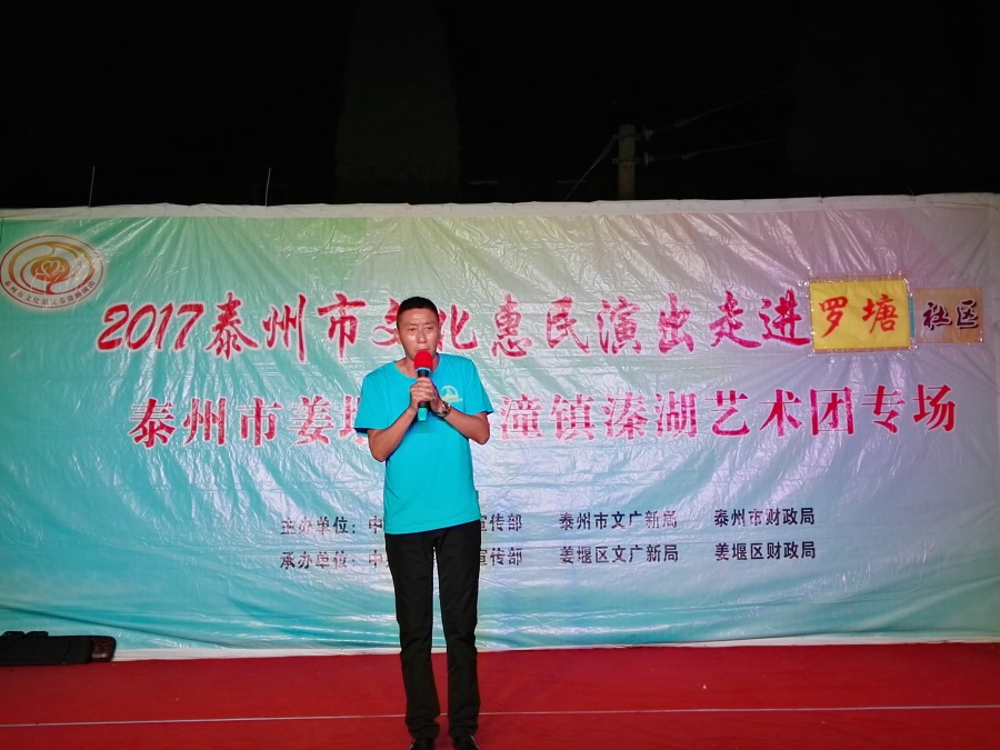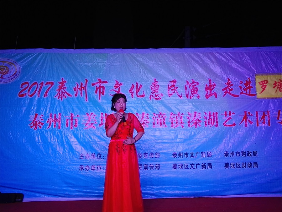 9月13日,秋高气爽姜堰区溱潼镇溱湖艺术团应姜堰镇罗塘社区邀请,2017年泰州市文化惠民券专场演出于当晚7点二十分,在社区百姓大舞台上演。为适应观众不同层次的文化欣赏需求,溱湖艺术团精心策划了13个丰富多彩的文艺节目,随着欢快喜庆的音乐响起,舞蹈《红红火火大中华》拉开了演出序幕,当晚演出不仅有激情奔放的民歌与民舞,而且有耳熟能详的戏曲,淮剧《手捧枝头花香藕》,还缴请当地群众上台表演,最后在歌伴舞《阳光路上》结束晚会,整台演出效果好,弘扬社会正气,倡导诚实守信,气氛热烈,掌声不断,赢得了广大观众的一致好评。当天晚上演出时长90分钟,观众达到400多人,优美而精彩的表演,给居民送去一份丰盛的文化大餐。
