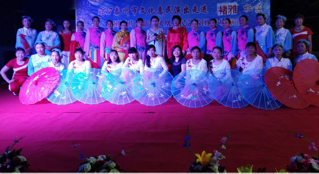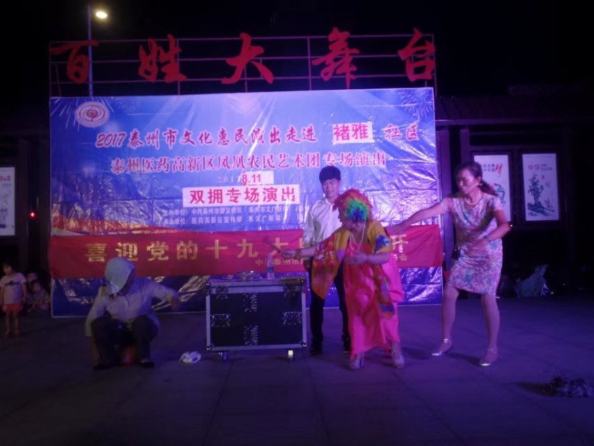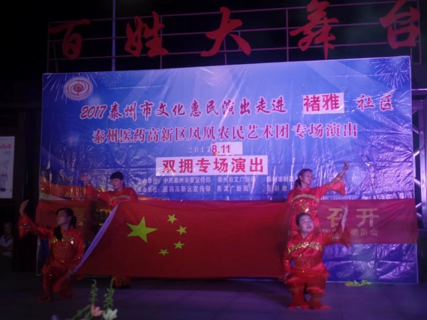 2017年8月11日,医药高新区凤凰农民艺术团文化惠民演出走进野徐镇褚雅社区。演出现场,凤凰农民艺术团通过乐团、民乐、舞蹈、合唱、小品、戏剧等节目为社区居民带来了一场精彩的表演。本次演出节目形式多样,内容丰富,得到了居民热情回应,赢得了台下观众的一致好评,现场掌声不断,欢笑声不断。