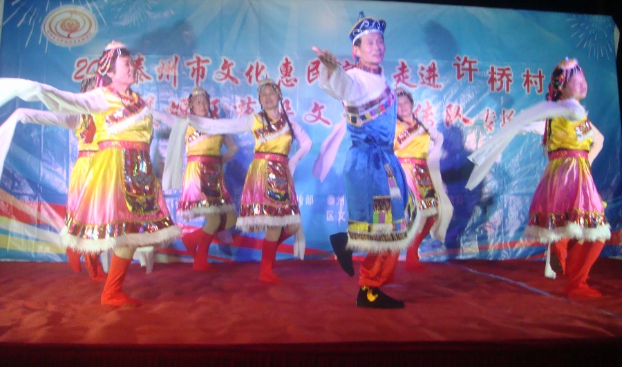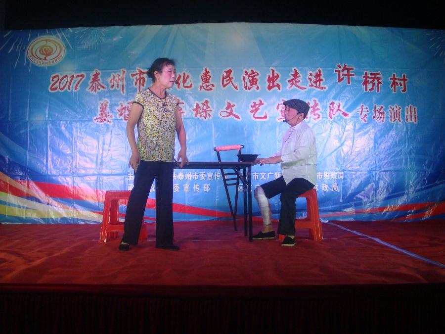 9月14日,姜堰区蒋垛镇文艺宣传队走进蒋垛镇许桥村,晚上7点钟在许桥村部广场开演,表演的节目有舞蹈《再唱山歌给党听》、戏剧《探寒窑》、表演唱《双回门》、对唱《浏阳河》、小品《充话费》等,节目形式多样,内容丰富,整场演出115分钟,观众300人左右,赢得广大观众的好评。