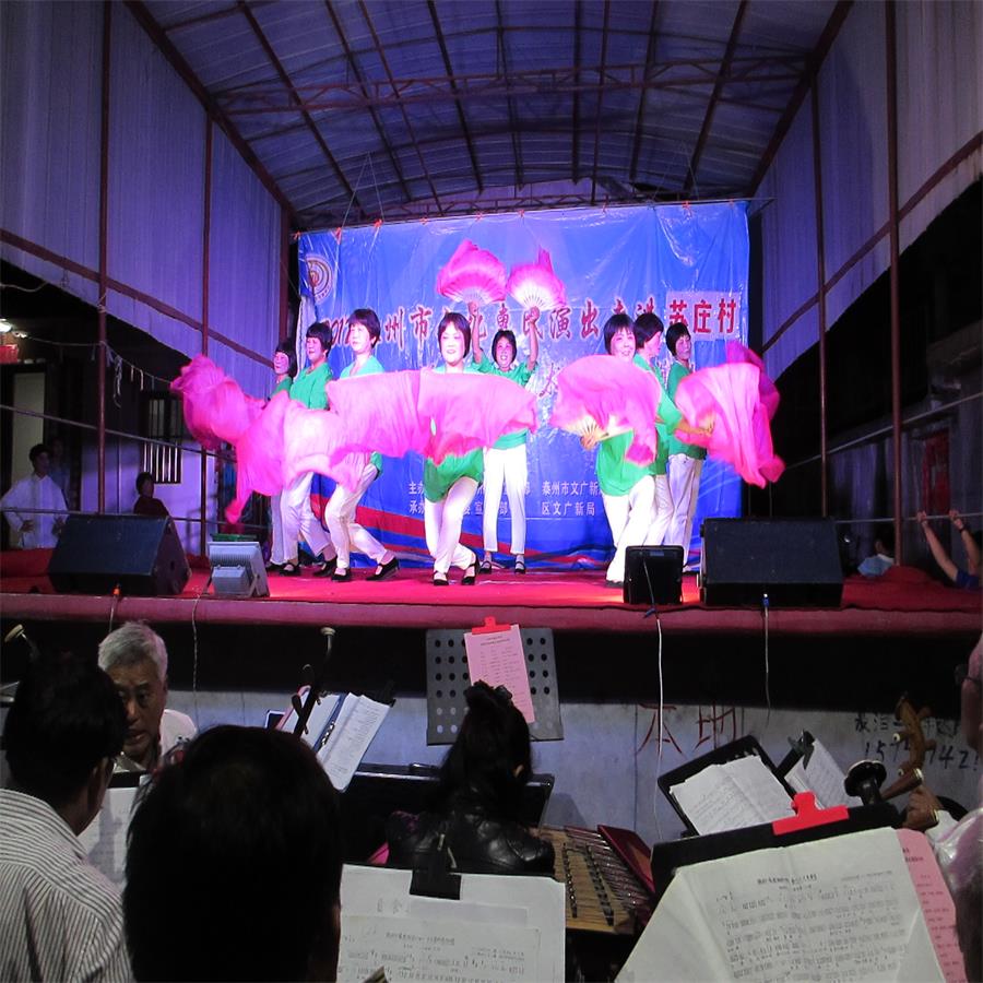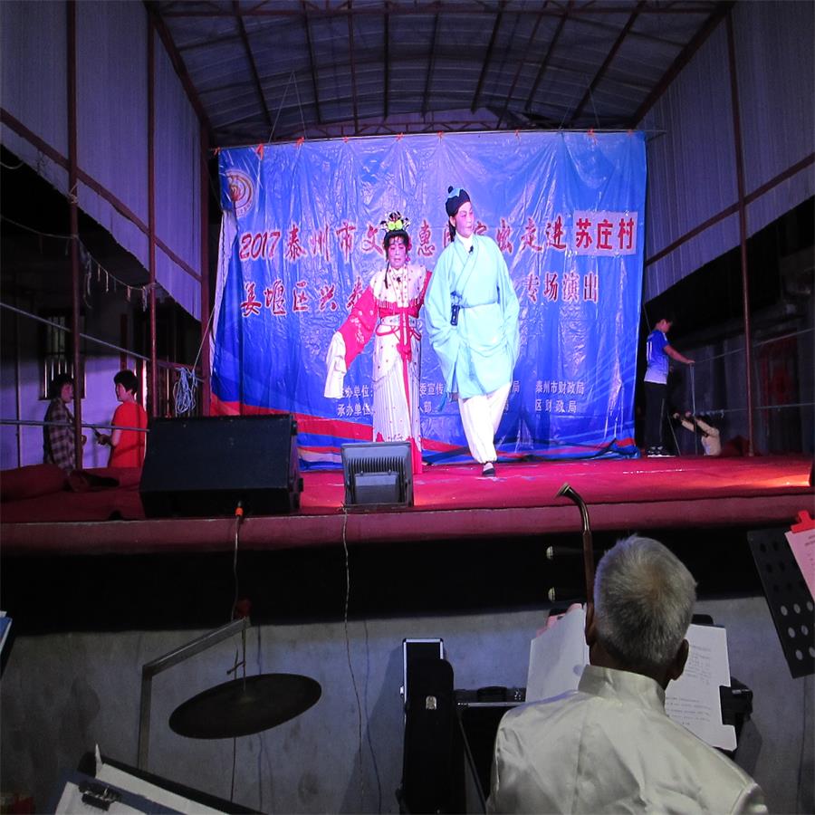 7月13日晚,应兴泰镇苏庄村邀请,姜堰区兴泰草根文化艺术团来到苏庄村惠民演出。7点整,欢快热烈器乐演奏拉开了演出的帷幕。艺术团给观众带来了形式多样的文艺节目,有歌舞,有说唱,有小品,还有传统戏曲表演和民歌、号子等。整场演出110分钟,吸引了300多观众,场上观众掌声不断,受到了一致好评。
