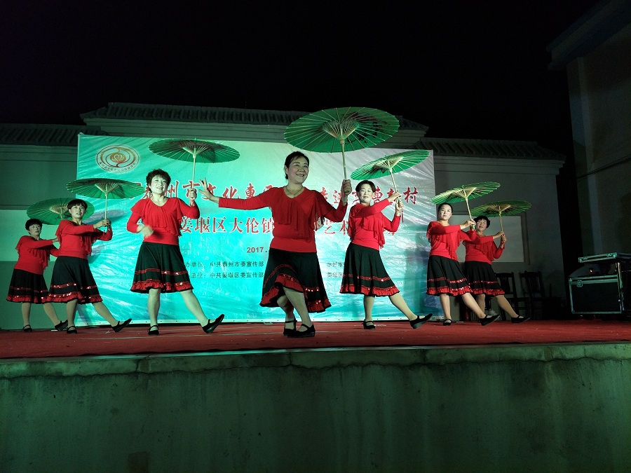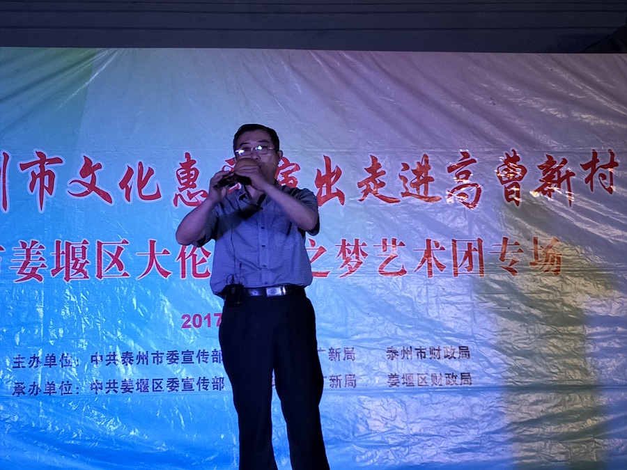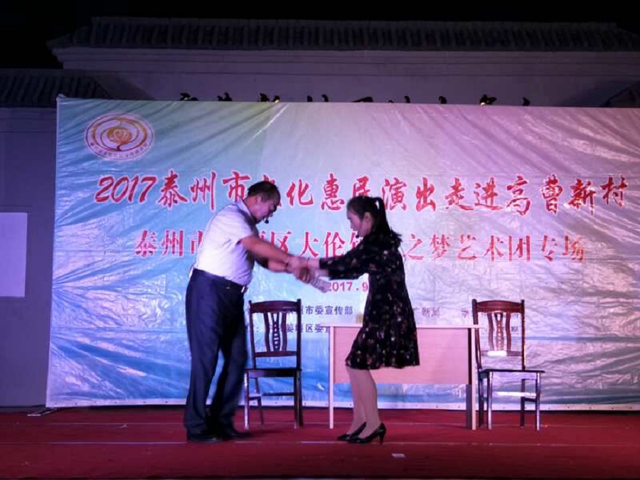 唱着红红火火的歌谣,抒出胸中的豪迈,舞起醉人的红绸,我们和着时代的节拍,应姜堰区蒋垛镇高曹新村邀请,大伦秋之梦艺术团9月14日晚进行专场惠民演出,在深化全国文明城市创建的进程中,高曹新村容村貌,焕然一新,百姓舞台别具一格。由于村里宣传到位,七点不到广场上就坐满了观众,艺术团精心编排了以弘扬社会主义核心价值观,“三大主题”美德善行为主题的多种形式,内容丰富多彩的十多个节目。一个个精彩纷呈,一次次掌声不断,近两个小时的演出给观众带来了美好的文化享受。也给人民留下了深刻的印象。村领导以及老百姓看了这台节目齐夸,秋之梦这台节目紧跟时代,围绕中心,主题突出,贴近生活,欢迎你们下次再来。