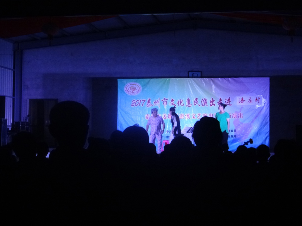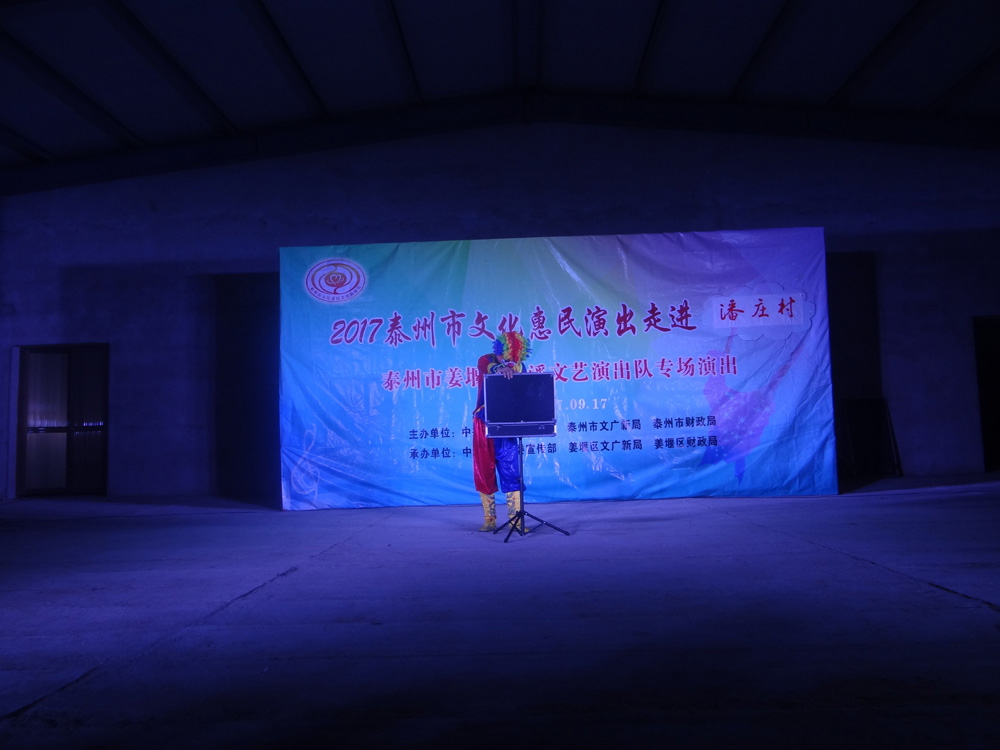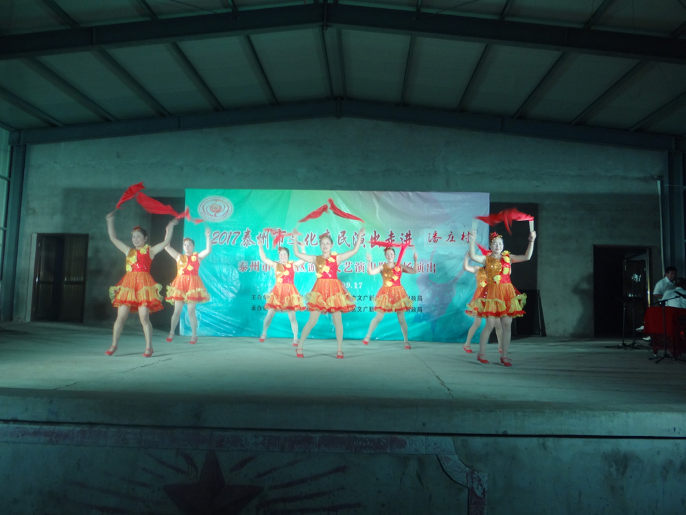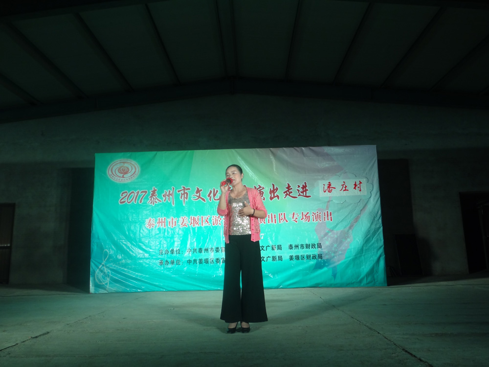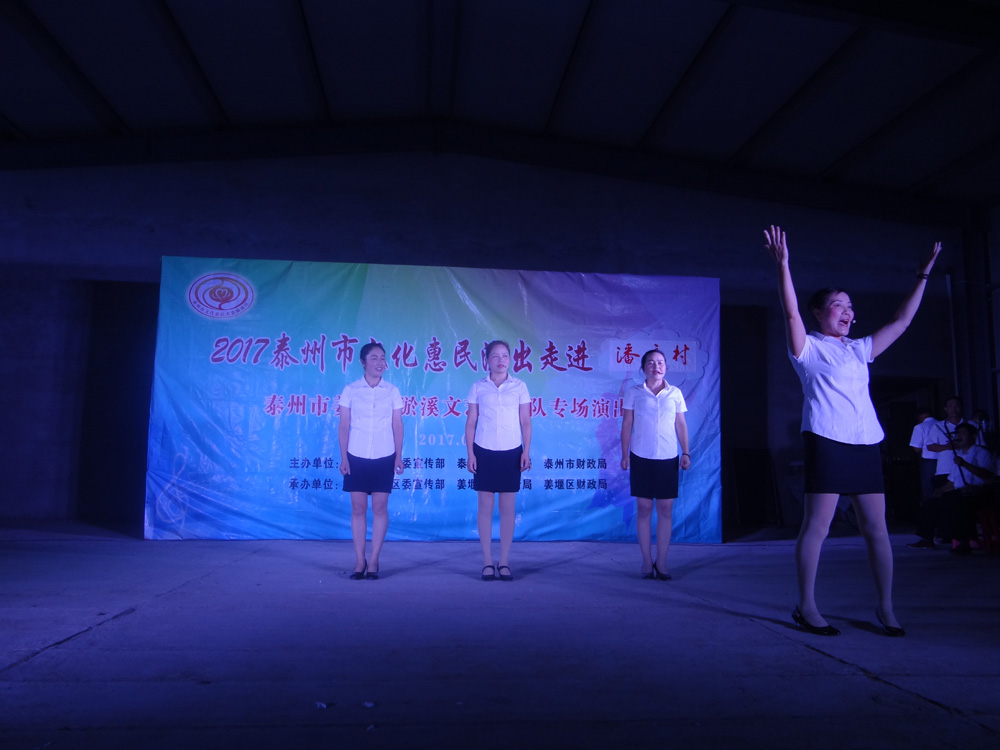 2017年9月17日我们淤溪文艺演出队应潘庄村邀请,为潘庄村民表演了一场丰富多彩的惠民演出,演出内容有戏曲,歌曲,小品,三句半,表演唱,杂技魔术和器乐小合奏等,观看人数五六百人,不时发出阵阵掌声,喝彩声,这是给演员最大的鼓励,演员们个个精神饱满,情绪高昂,演出结束时,不少观众不愿离去,两个多小时演出还嫌不过瘾。演出开始前更令人感动的是有的村民自发放烟花鞭炮欢迎我们的到来,通过这次演出,更加激发了我们全体演职人员的演出热情,大家表示今后要更加努力工作,不断提高演出水平来报答广大观众。