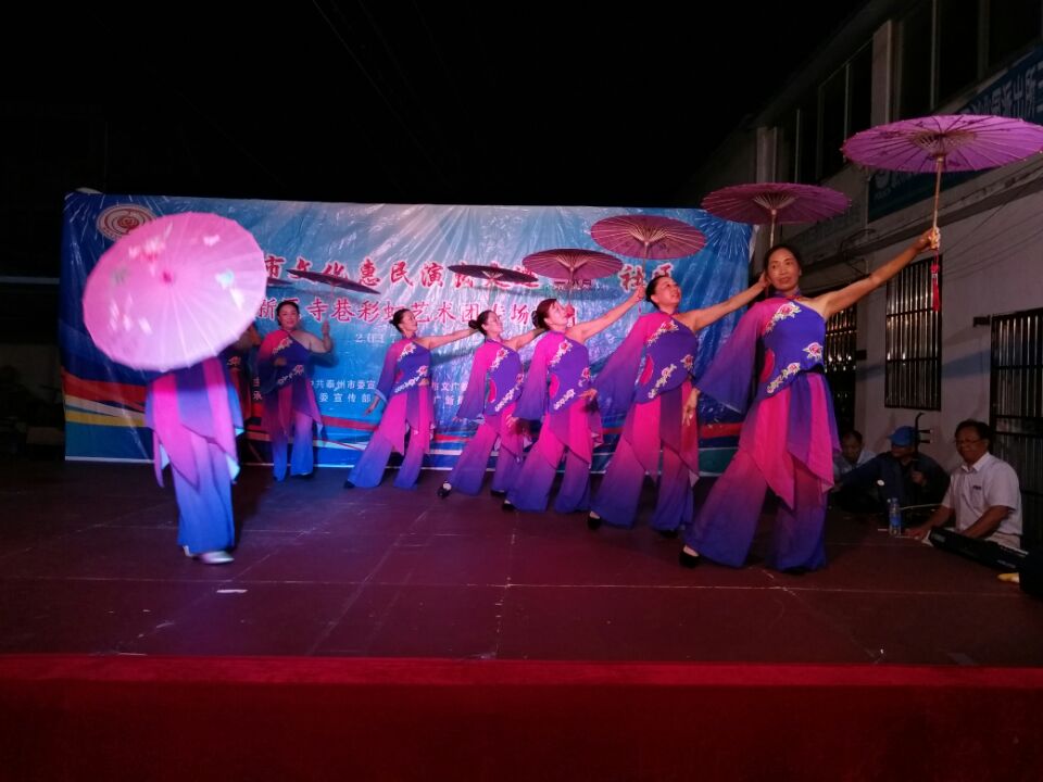 8月18日寺巷彩虹艺术团文化惠民专场演出走进高港许庄三旗营社区。晚上7点半在三旗营社区广场准时开始,现场表演节目由《开门红》拉开序幕,紧接着是女生独唱、舞蹈 、表演说唱《赞家乡》小品、戏曲选段 等等,精彩的节目一个接一个,观众们掌声、喝彩声不断,寺巷彩虹艺术团演员们的精湛表演让居民们大开眼界,更让他们陶醉在优美的旋律中和欢快的舞步中,最后在《难忘今宵》中结束这场演出,得到大家的一致好评。