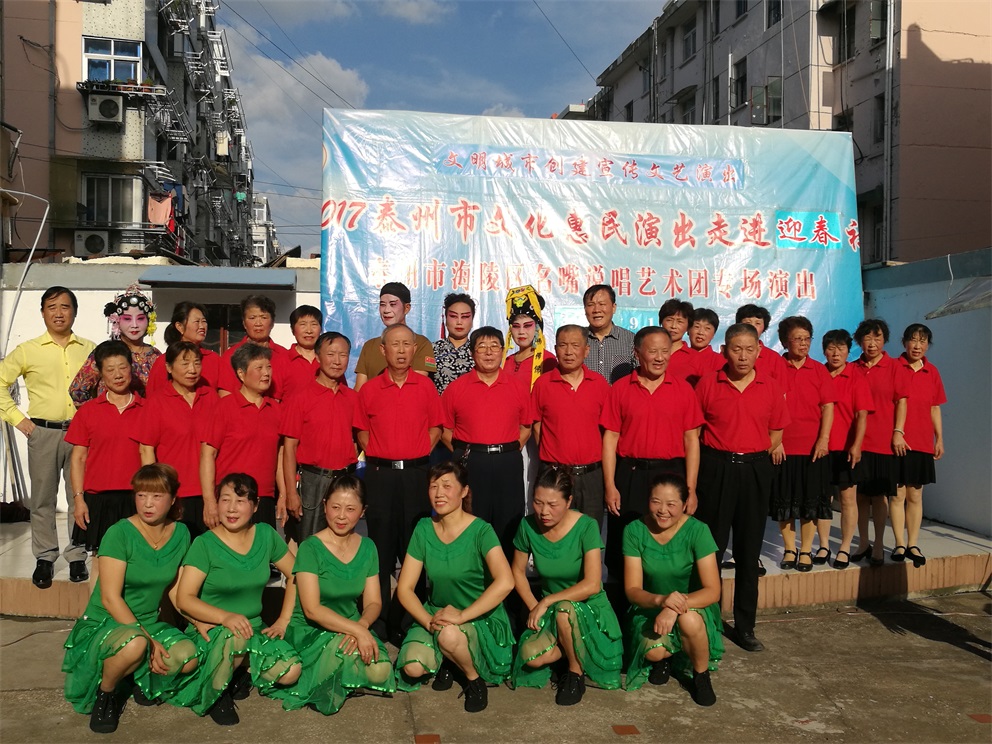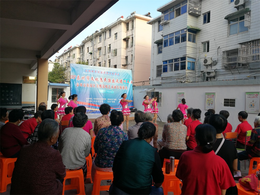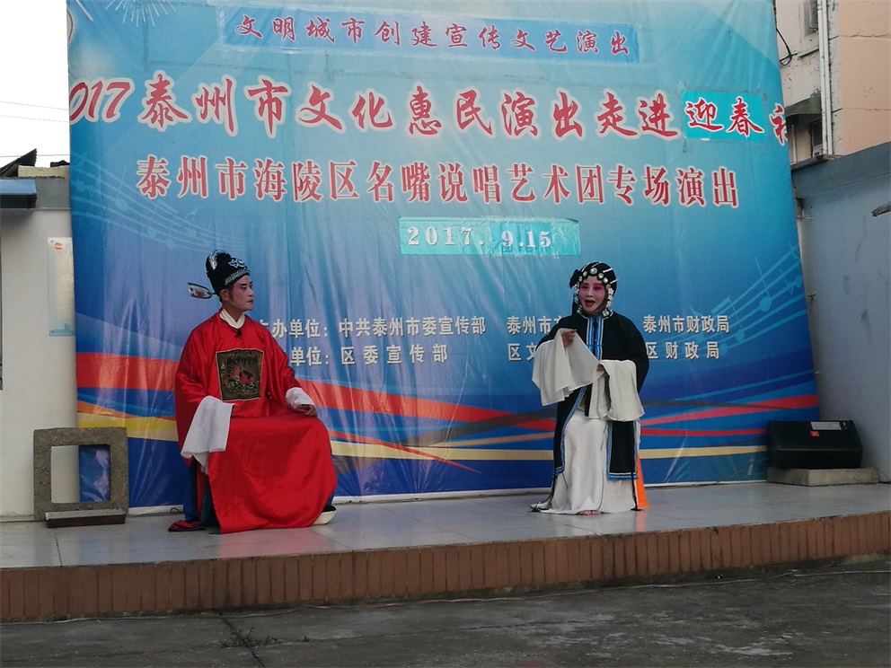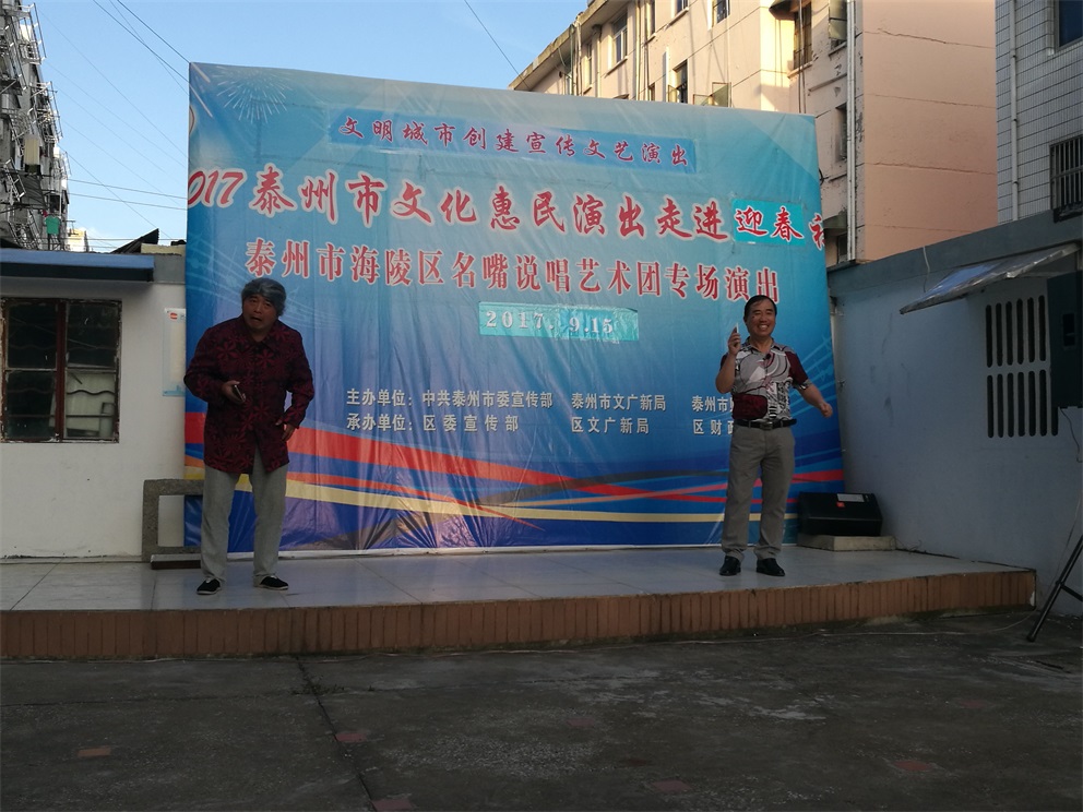 2017.9.15号下午艳阳高照,海陵区名嘴说唱艺术团来到了城东街道迎春社区,演出了一台丰富多彩的文艺节目,为社区群众送来了精神食粮。应观众要求原来90分钟的演出,又延长了30分钟,增加了部分观众喜爱的内容。赢得了社区群众的一致好评。