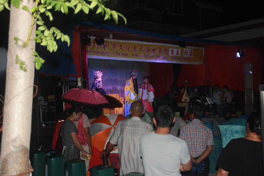 明珠街道鑫泰花园社区,为基层社区居民带来了一场经典传统扬剧全本戏《狸猫换太子》。为了保证社区群众的欣赏效果,艺术团动用了戏曲演出专用舞台,下午5点,社区主要领导和小雨天艺术团就来到演出现场,为晚上的演出做好了充分准备。节目晚上正点准时开演,现场200多的社区观众看的是兴致勃勃,高潮之时,广场更是掌声雷动,很多观众都说,看到这样的正规化演出,才是感觉到了真正的文化惠民。因现场社区观众的盛情,正本演出后还添续了折子戏段加唱,整场演出持续了3小时之多...