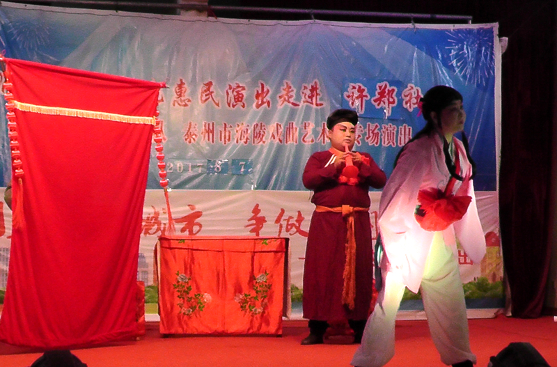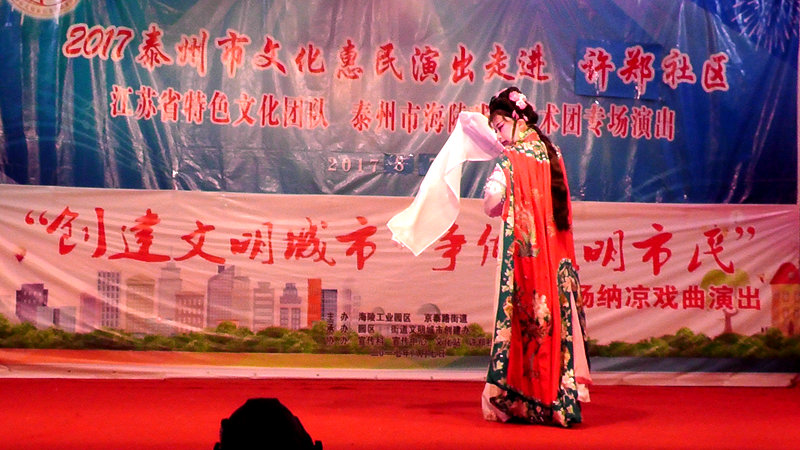 泰州市海陵戏曲艺术团于2017年8月7日晚7点30分在海陵区京泰路街道许郑社区文化广场演出大型优秀传统扬剧——《逃婚的新娘》。我团参演人员25人,由于许郑社区积极宣传,前来看戏的群众近100人,人民需要文化,文化需要人民,演出现场气氛热烈,观众掌声不断,演出圆满成功。这更加激起我们为老百姓排好戏、演好戏、唱好戏。把泰州市文化惠民演出活动锦上添花,更上一层楼。