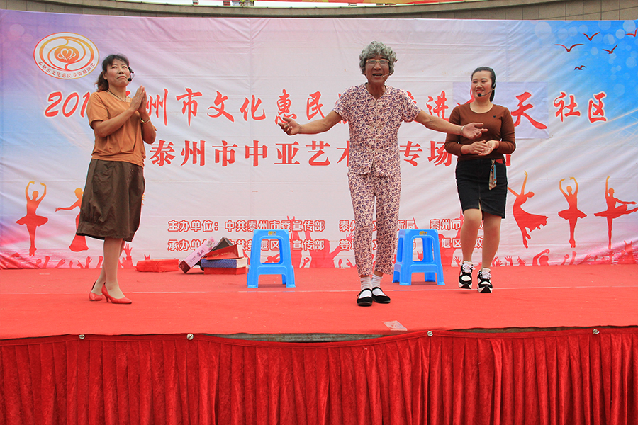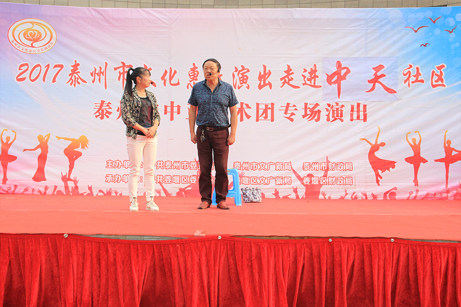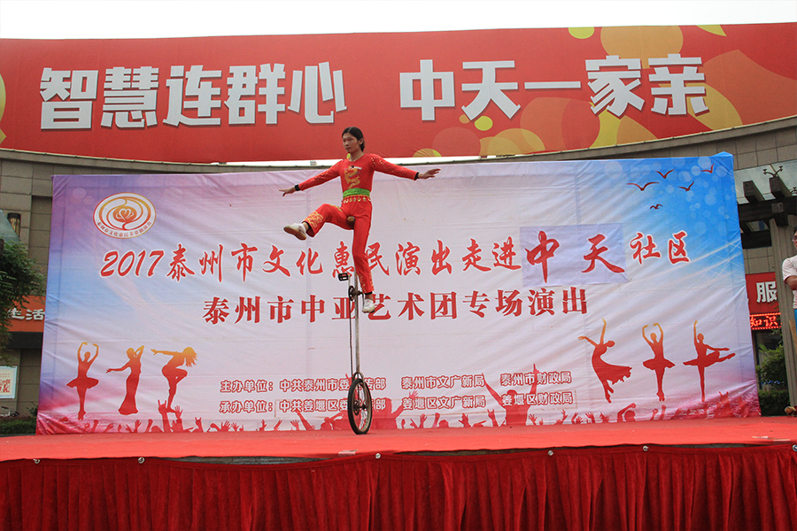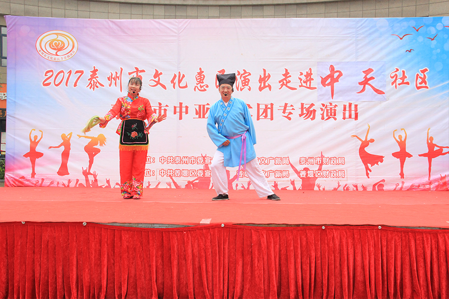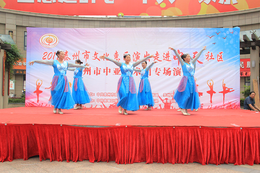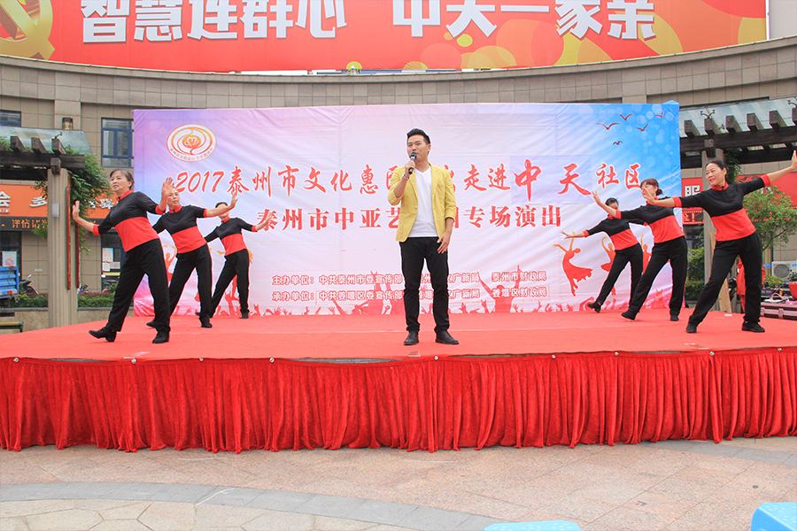 2017年9月22日,中亚艺术团应中天社区邀请,2017年泰州市文化惠民专场演出于当日3点在中天社区社区广场上演。为适应观众不同层次的文化欣赏需求,中亚精心策划了丰富多彩的文艺节目,随着欢快喜庆的音乐响起,开场舞蹈拉开了演出序幕,当日出不仅有激情奔放的歌曲与舞蹈,而且有耳熟能详的戏曲与小品,整台演出效果,弘扬社会正气,倡导诚实守信,气氛热烈,掌声不断,赢得了广大观众的一致好评。当天下午演出时长120分钟,观众达到200多人,优美而精彩的表演,给中天社区送去一份丰盛的文化大餐。
