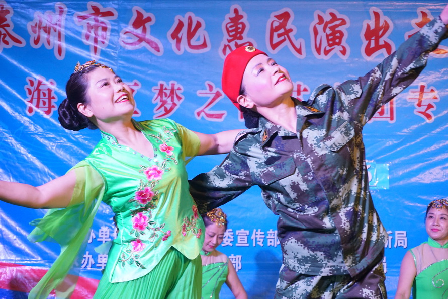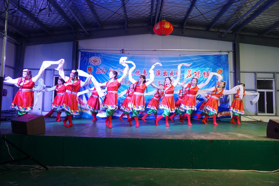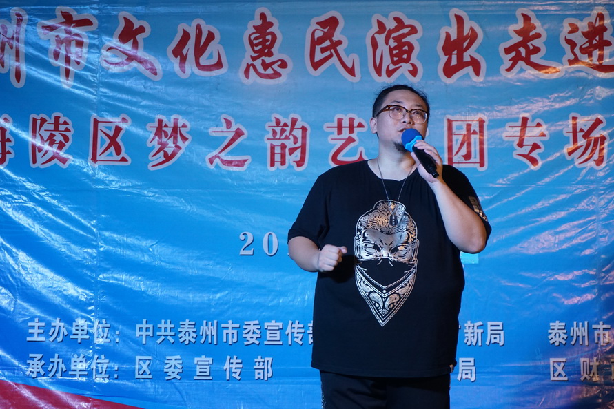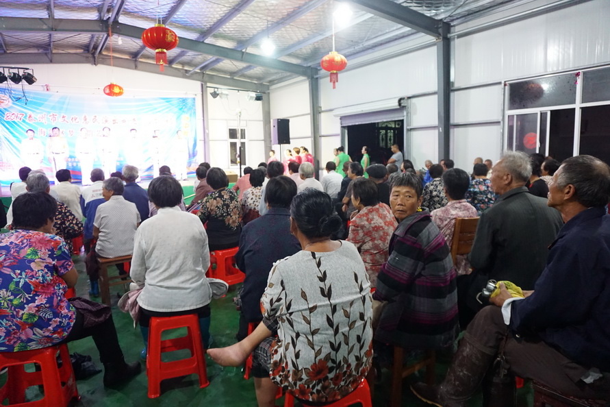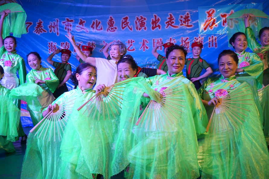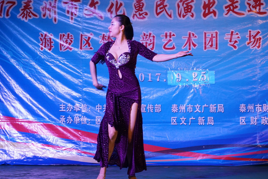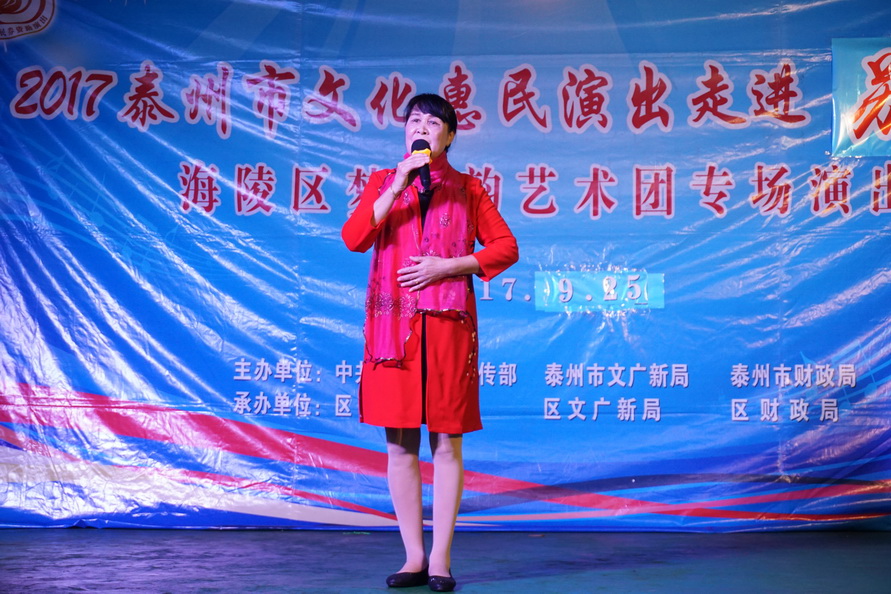 苏陈镇,一个东面与姜堰区相连,西面与海陵区接壤的历史古镇,2017年9月25日苏陈镇的周埭社区迎来了一批特殊的客人-----海陵区梦之韵艺术团。应周埭社区邀请,海陵区梦之韵艺术团走进古镇,走进乡村,为这里的父老乡亲进行文化惠民演出。当天秋雨滂沱,道路湿滑,艺术团的演员们克服恶劣天气带来的各种不便,顶风冒雨赶到了现场,迈进周埭社区的室内百姓大舞台,只见百十位周埭村民早已携家带小济济一堂围坐在舞台前.......。灯光亮起,音乐响起,舞姿飘起,歌喉扬起.......,村民们随着精彩节目的一一的登场,时而笑逐颜开,时而自我陶醉,时而掌声回应......。为了准备这场演出,艺术团探究古镇乡村的文化底蕴和淳朴民风,优中选优编排了十四个精彩的节目.......,但当报幕员与观众依依惜别时,村民观众们依然余兴未尽,连声欢呼再来一个,于是艺术团又加演了一个节目......。两个小时的演出为古镇乡村带来久久的欢快。
