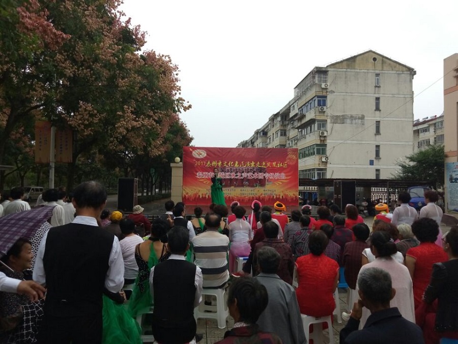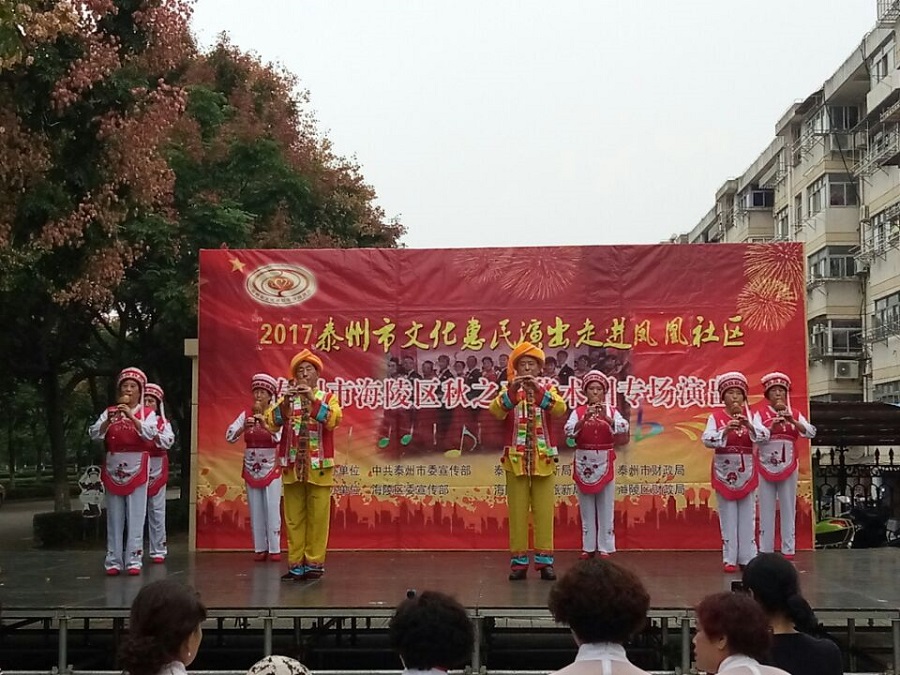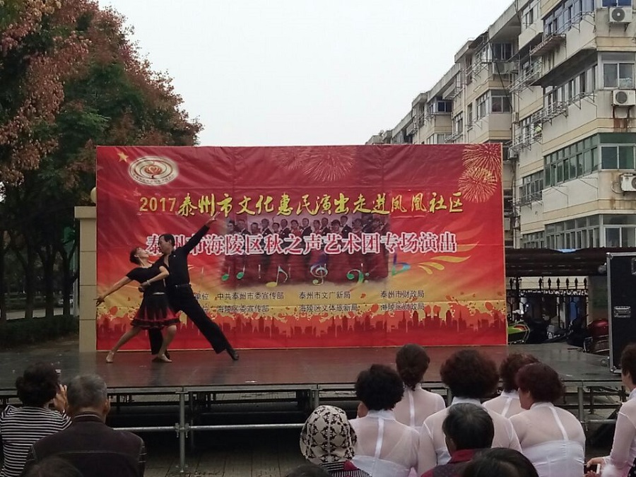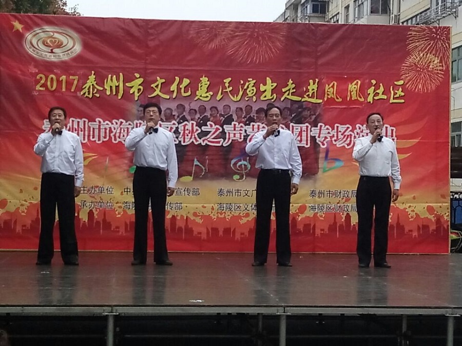 2017年9月27日下午3点00分,泰州市海陵区秋之声艺术团应泰州海陵区凤凰社区邀请惠民演出走进凤凰社区。当天下午在三号区南门外广场演出,虽然下午的天气阴有时有毛毛细雨,观众达一百多人早早来到演出现场。演出节目共有17个,其中舞蹈美丽中国梦、旗袍走秀好一朵茉莉花、男声四重唱少林少林、京剧梨花颂、前门情思大碗茶等节目的精彩表演让全场掌声不断,把演出推向高潮,当谢幕曲难忘今宵奏响时,观众依依不舍,整场演出给观众留下了良好的印象。