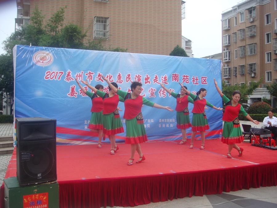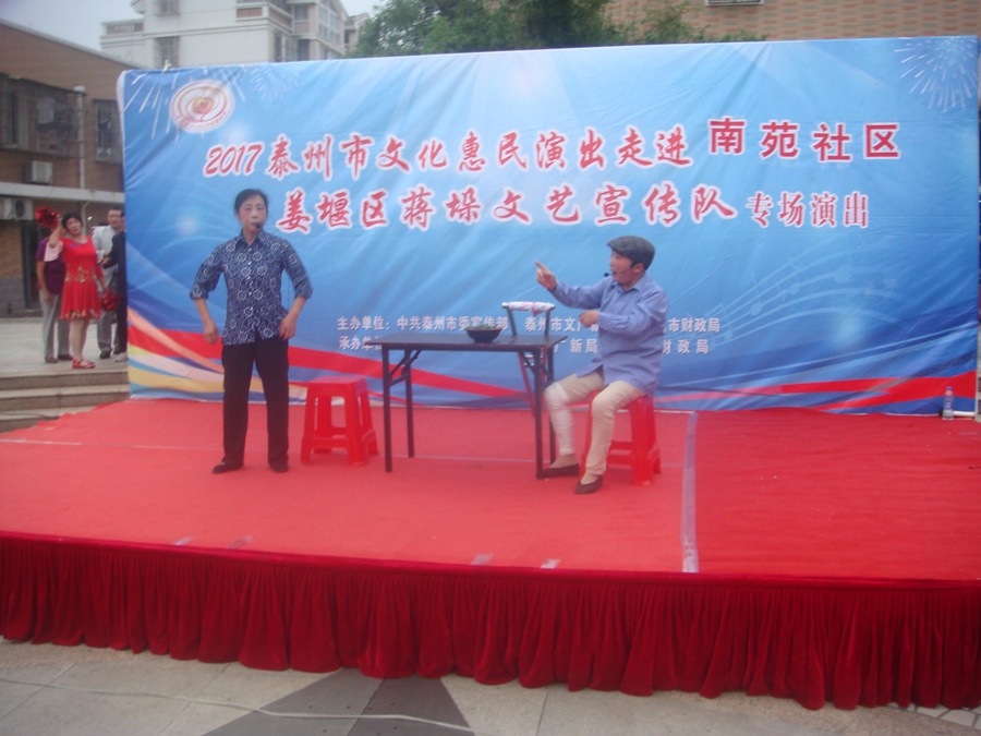 2017年9月27日,姜堰区蒋垛文艺宣传队走进姜堰区罗塘街道南苑社区,下午3点为南苑居民惠民演出丰富多彩的文艺节目,节目形式有扬剧《双下山》、黄梅戏《路遇》、小品《一头精失算》、表演唱《双回门》、舞蹈《赞歌》等。演出时长100分钟,300多观众掌声不断,笑声不断,都说漂亮。