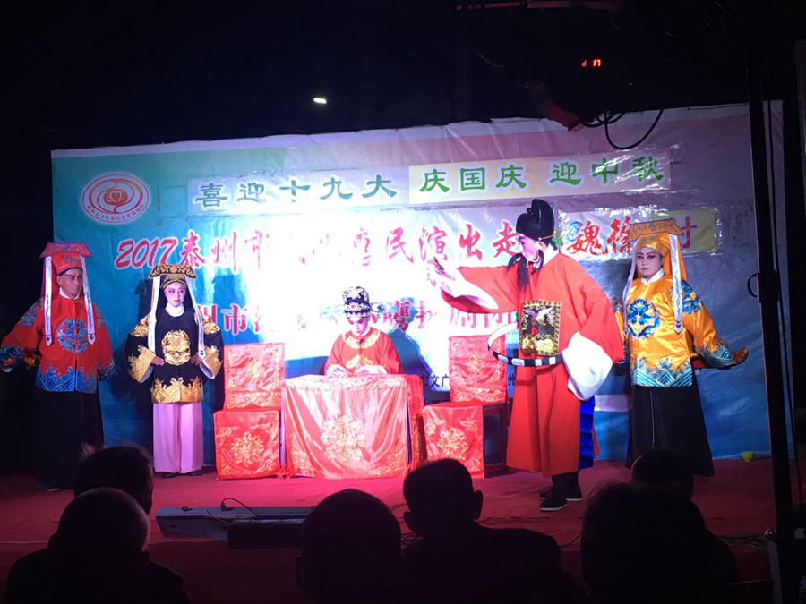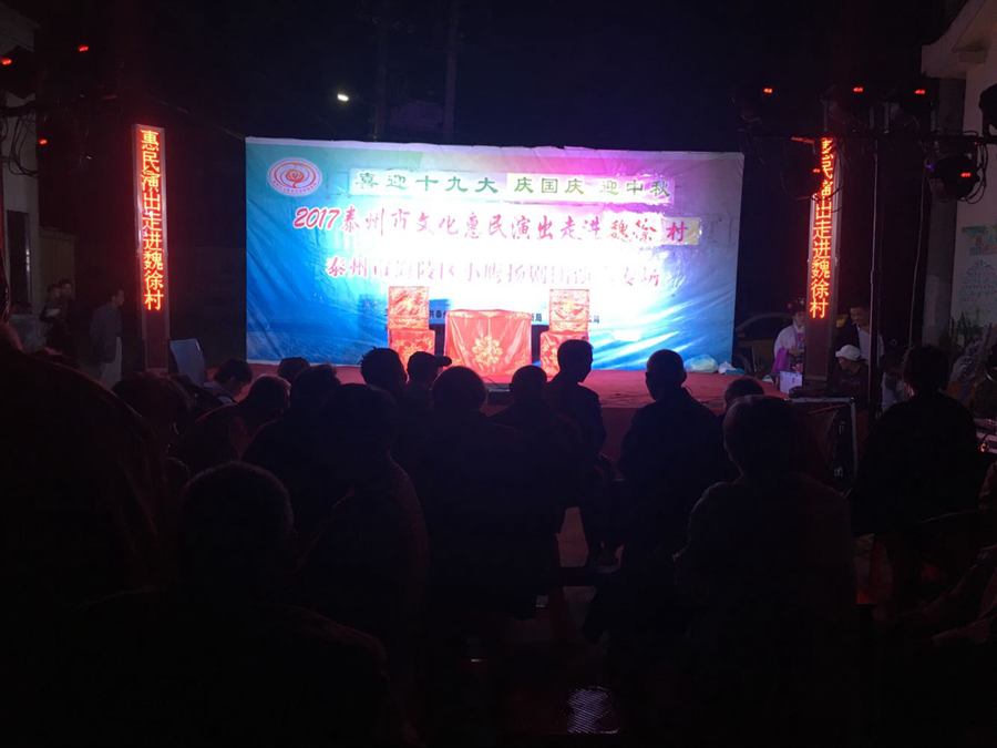 2017泰州市文化惠民演出走进海陵区城东街道许郑魏徐村,海陵区小鹰扬剧团专场演出,2017年9月23日晚上在海陵区城东街道魏徐村法华寺广场成功举办。本场演出应村领导要求,演出的剧目为大型传统扬剧《分裙记》上下集,演出时长180分钟,演员们精彩的的表演博得了观众的阵阵掌声。演出很成功!感谢村领导提供全方位的服务。
