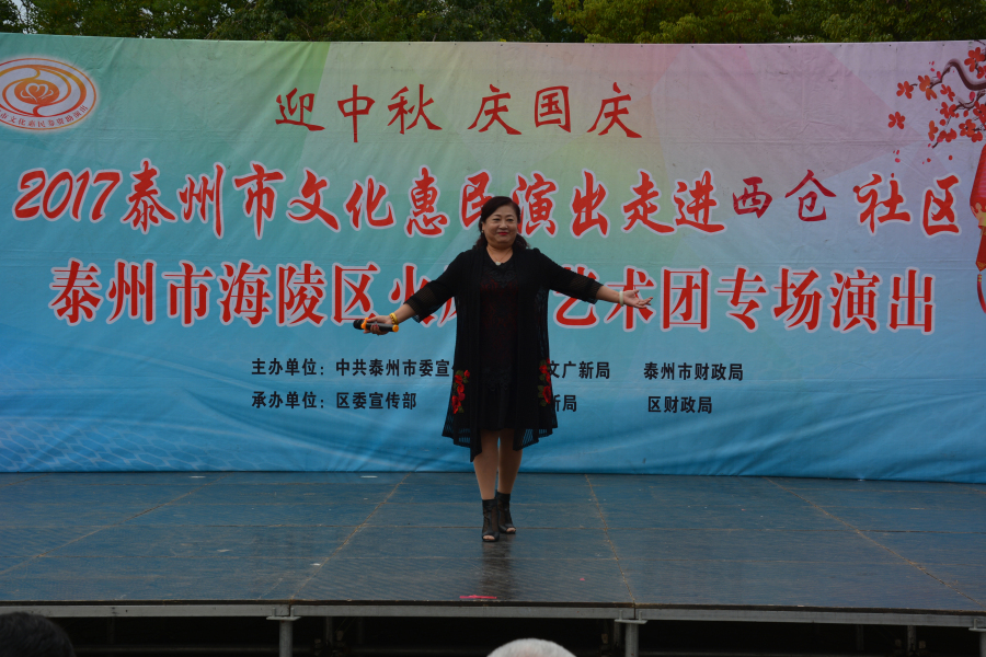 9月29日下午,火凤凰艺术团在海陵区城西街道西仓社区(招贤桥西侧的海阳园)进行《迎中秋 庆国庆》专场文化惠民演出,这一专场文化惠民演出惠及东至卤汀河,南至东进西路,西至江州路,北至海阳路的西仓社区所有居民。这里环境优美,居民们有在家门口看戏的文化需求,火凤凰艺术团为此精心准备了16个节目,让大家在门口享受了一次文化大餐。演出结束后,有几个居民还拉着演员的手,非常高兴地说:“你们演的节目精彩,我来晚了,请告诉我明天在那,我还去看”,演员热情的回答“明天在迎春社区”,他们流露出了满意的笑容“那明天见”。