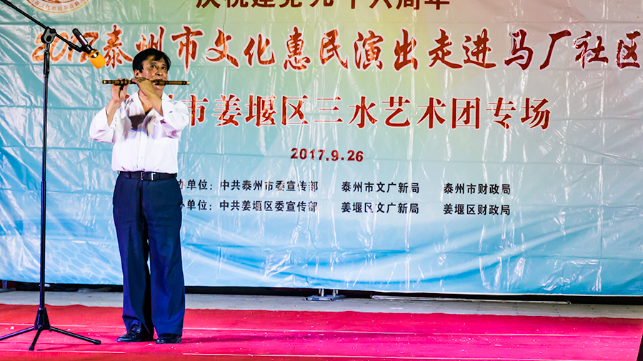 2017年9月26日应姜堰区三水街道马厂村的盛情相邀,姜堰区三水艺术团来到马厂村百姓大舞台进行文化惠民演出。村民们听到音乐响起有的拿着橙子、有的扶老携幼来到百姓大舞台前等候观看演出。晚七时演出正式开始。艺术团准备了丰富多彩的文艺节目。有器乐合奏、独奏,有男、女声独唱,有小品,有戏曲,有舞蹈、朗诵等。村民看了拍手叫好。演出时长110分钟,观众近500人。