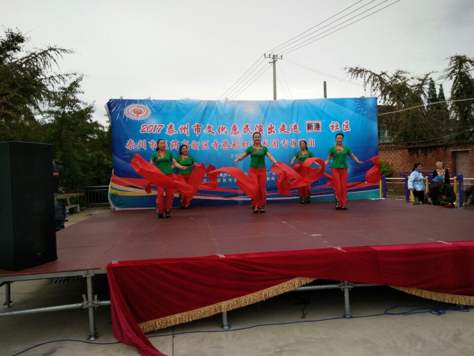 10月2日,寺巷彩虹艺术团文化惠民专场演出走进寺巷街道新港社区。演出于下午1点半在新港社区广场准时开始,现场表演节目由《红红火火大中华》拉开序幕,紧接着是女生独唱、舞蹈 、表演说唱、小品、戏曲选段等等,精彩的节目一个接一个,观众们掌声、喝彩声不断,寺巷彩虹艺术团演员们的精湛表演让居民们大开眼界,更让他们陶醉在优美的旋律和欢快的舞步中,演出最后在《歌唱祖国》中结束,得到大家的一致好评。
