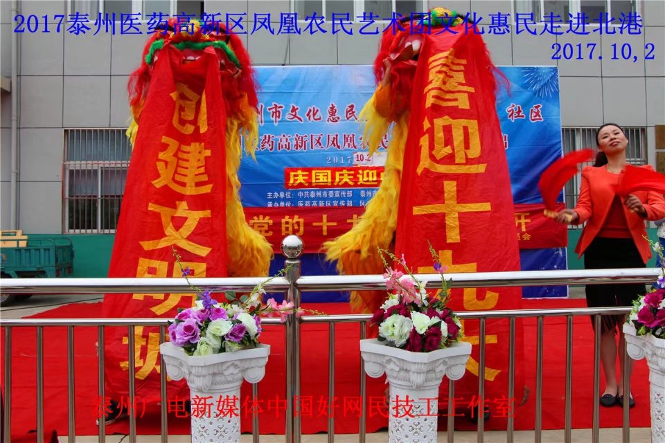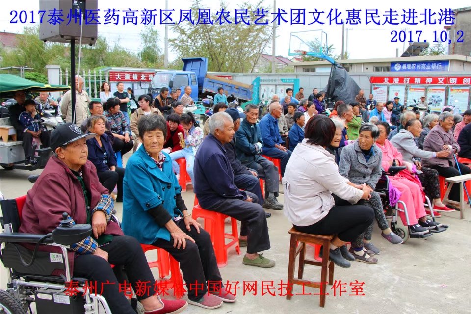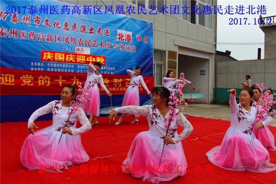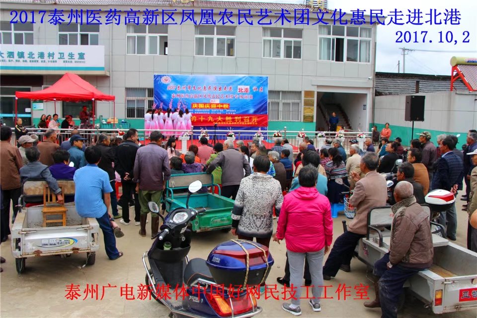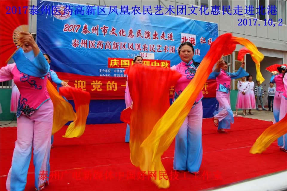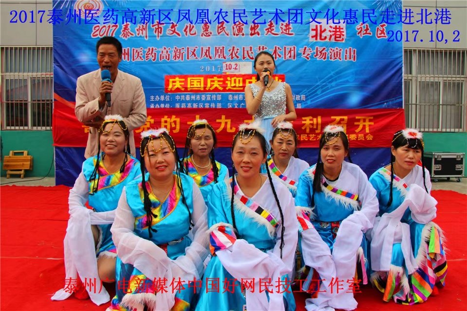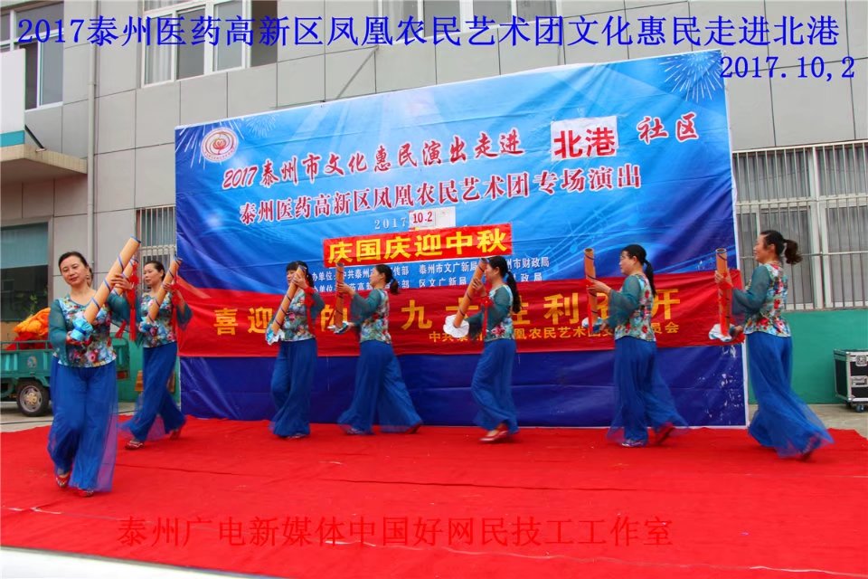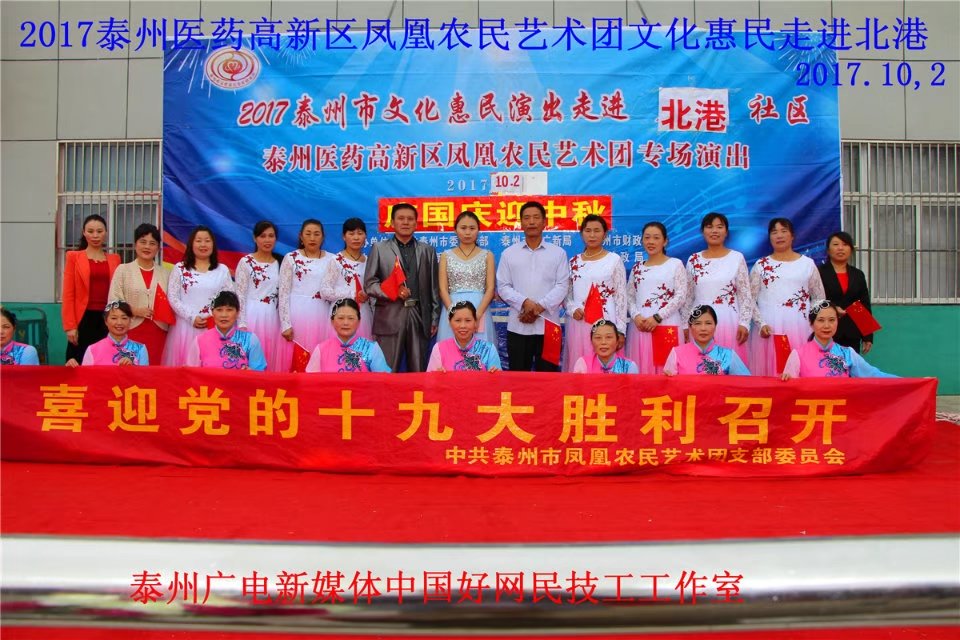 10.2白天,泰州市凤凰农民艺术团应高港区大泗镇北港村邀请,在北港村进行文化惠民专场演出,恰巧喜迎国庆节,艺术团的演员为北港村的居民送来了节日的问候,精彩的演出吸引了近500名观众,演出期间演员们载歌载舞,为民众们送上了一首有一首的好歌,引来的大家的欢呼声,表演结束后,大家迟迟不愿离去,临走时还一直跟艺术团的团长沟通,希望他们能够经常到来!