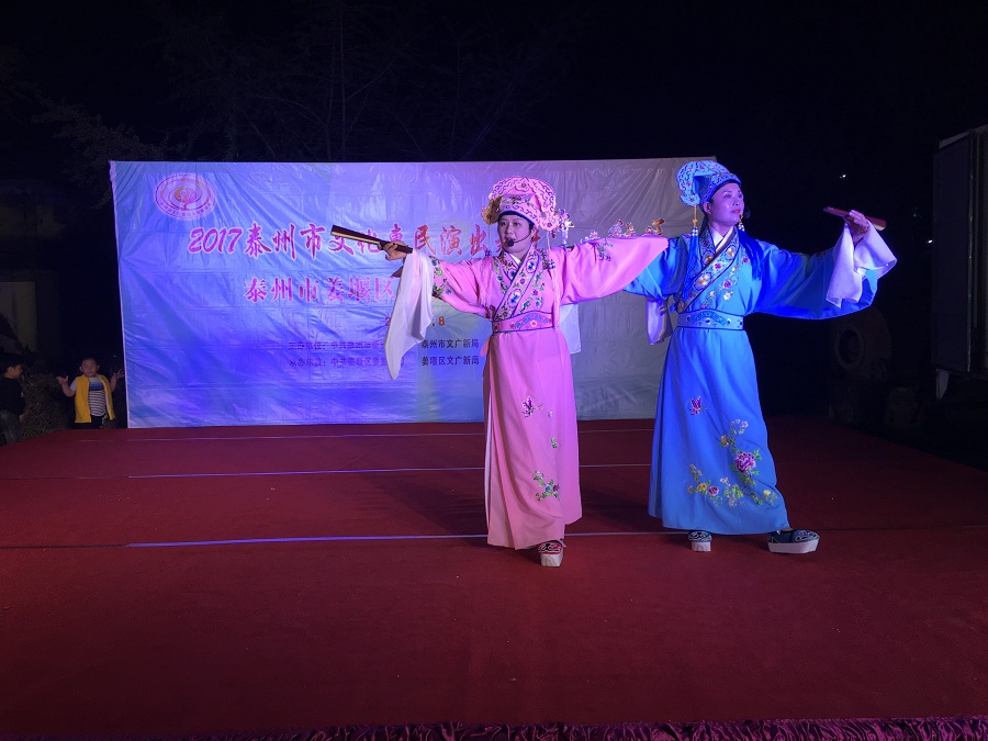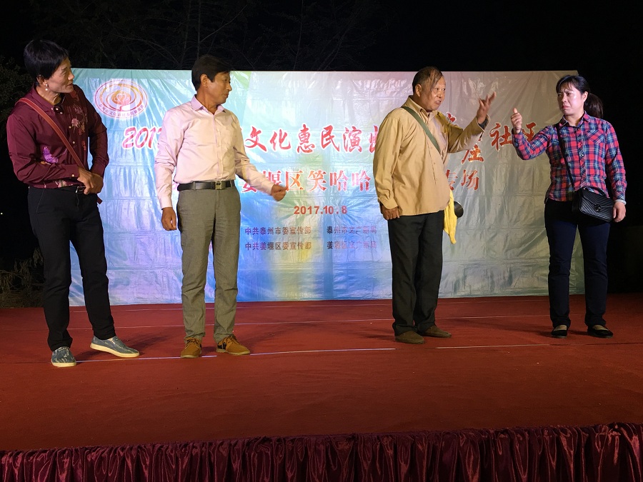10月8日,姜堰区笑哈哈艺术团文化惠民专场演出走进许庄社区。晚上7点演出在许庄社区准时开始,现场表演的节目有舞蹈《红红火火大中华》、莲花落说唱《莲花一打笑哈哈》、方言韵白《路在脚下》情景剧《老娘舅》萨克斯演奏《北国之春》、表演《回娘家》、天津快板《有话好好说》、相声《趣说泰州话》、表演唱《财政惠民乐农家》、以及独唱等11种形式、12个节目。整台演出时长115分钟,观众约1000人左右。节目形式多样、内容丰富,尤其相声、快板、喜剧小品、方言韵白等语言类特色节目赢得了观众的阵阵笑声和掌声,受到社区干部、群众的一致好评。