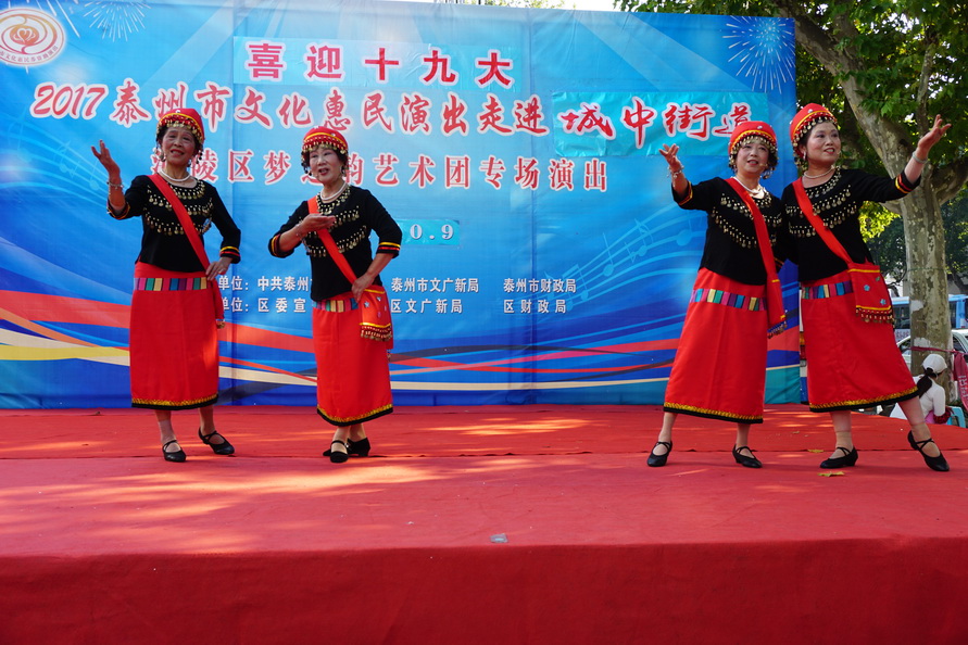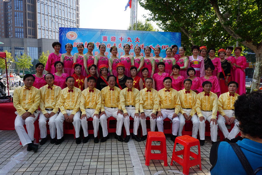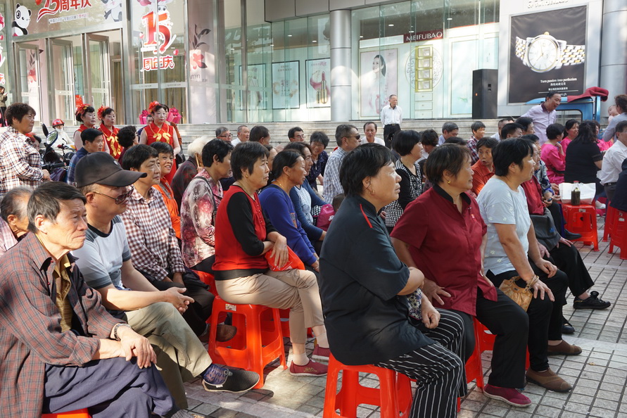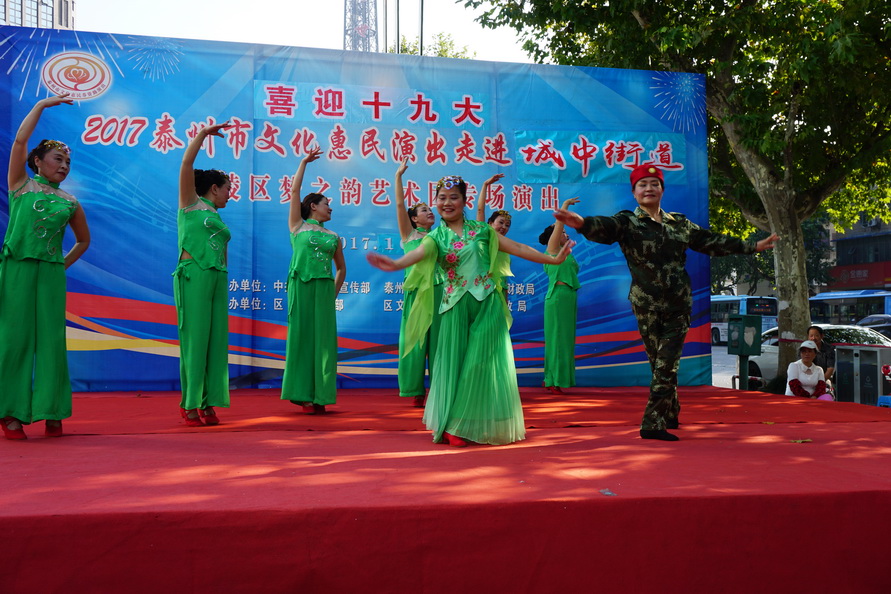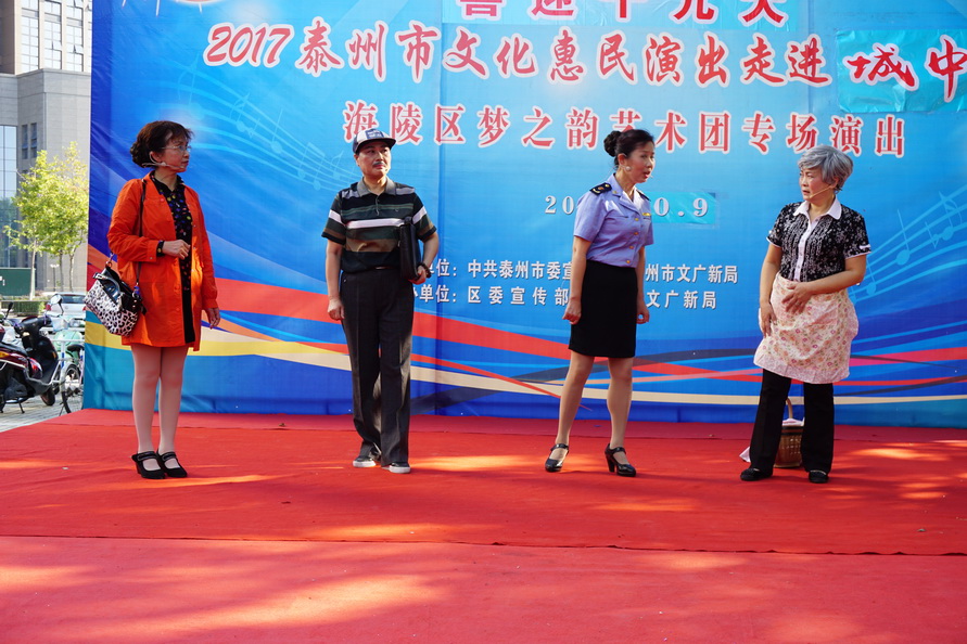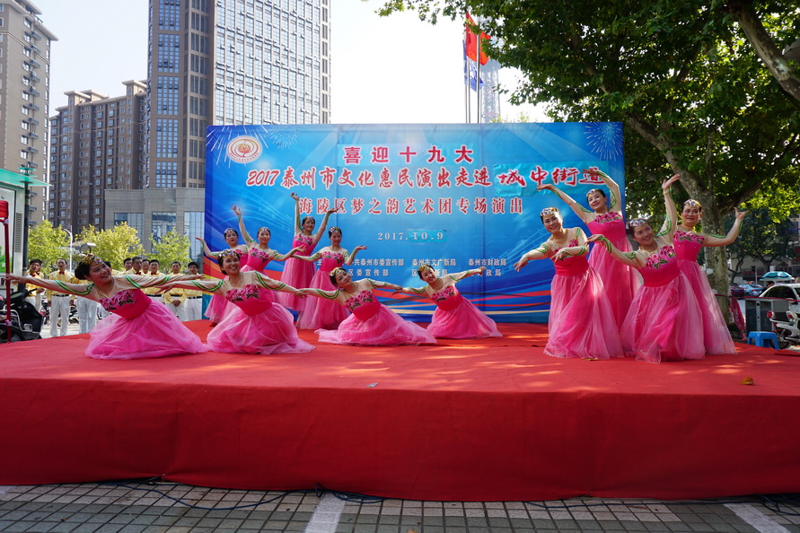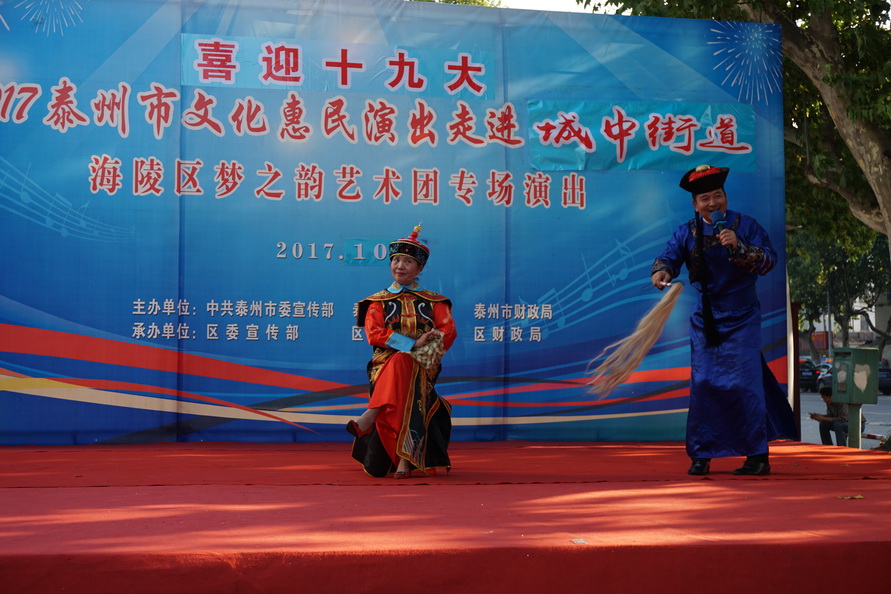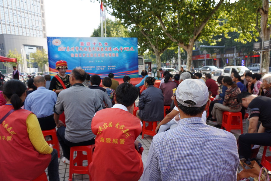 2017年10月9日,国庆中秋节后的第一个工作日,城中街道就盛情邀约梦之韵艺术团为辖区居民惠民演出。根据街道要求,为兼顾周边社区居民就近观看,演出舞台搭建在文峰千家惠的西广场。下午2点30分,在“喜迎十九大”大红字样的舞台上,演出在动听的音乐声中拉开帷幕。为了确保本场演出的质量,梦之韵艺术团的成员们长假未结束,与10月7号、8号就开始排练,并赶排了戏剧小品《世说》,演员们着清朝服装穿越来到现实中,以独特的表现形式展现着祖国的发展变迁,人民的生活水平提高......。精彩的节目不但吸引了毗邻周边社区的百十位居民前来观看,也吸引了逛商场的、路过的市民纷纷驻足观看......。
