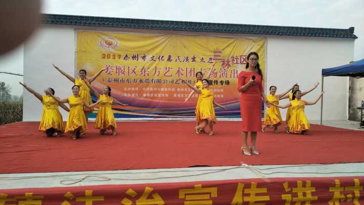 10月10日下午,姜堰区东方艺术团走进姜堰区三林社区,演出在热烈欢快的舞蹈《微笑》中拉开了帷幕,优美的舞蹈《江南梦》、女声独唱歌曲《万水千山总是情》、歌曲《山歌好比春江水》、富有地方特色的莲湘舞《杨柳青》、通俗易懂的方言小品《良心发现》……引得台下观众的阵阵掌声。