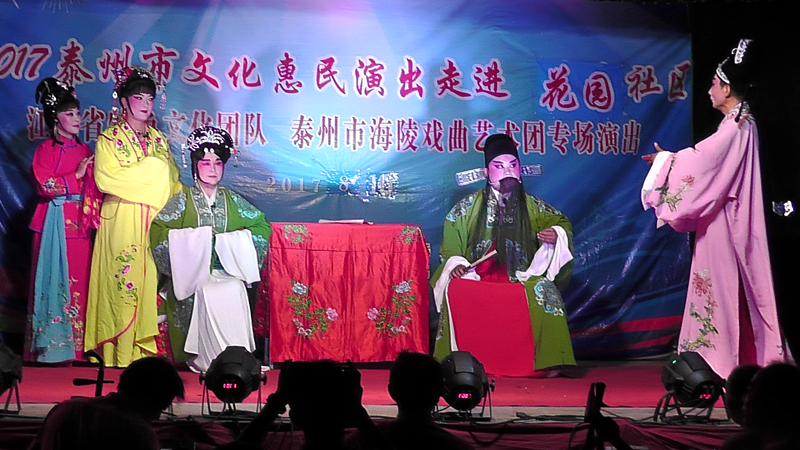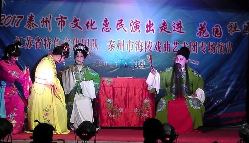 泰州市海陵戏曲艺术团于2017年8月10日下午13点30分在海陵区城东街道花园社区文化广场演出大型优秀传统扬剧——《碧玉簪》。我团参演人员25人,由于花园社区积极宣传,前来看戏的群众近250人,人民需要文化,文化需要人民,演出现场气氛热烈,观众掌声不断,演出圆满成功。这更加激起我们为老百姓排好戏、演好戏、唱好戏。把泰州市文化惠民演出活动锦上添花,更上一层楼。