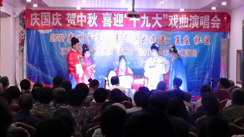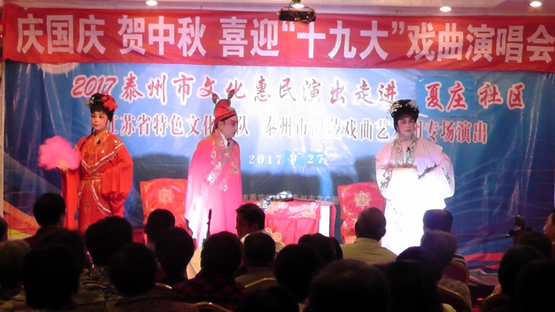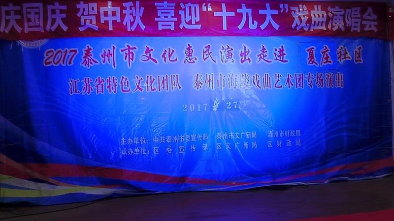 泰州市海陵戏曲艺术团于2017年9月27日下午19点30分在海陵区罡杨镇夏庄村室内舞台演出大型优秀传统扬剧——《夜明珠》。我团参演人员25人,由于夏庄村积极宣传,前来看戏的群众近300人,人民需要文化,文化需要人民,演出现场气氛热烈,观众掌声不断,演出圆满成功。这更加激起我们为老百姓排好戏、演好戏、唱好戏。把泰州市文化惠民演出活动锦上添花,更上一层楼。