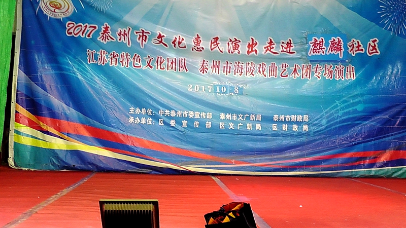 泰州市海陵戏曲艺术团于2017年10月08日晚19点30分在海陵区城西街道麒麟社区演出大型优秀传统扬剧——《逃婚的新娘》。我团参演人员25人,由于麒麟社区积极宣传,前来看戏的群众近300人,人民需要文化,文化需要人民,演出现场气氛热烈,观众掌声不断,演出圆满成功。这更加激起我们为老百姓排好戏、演好戏、唱好戏。把泰州市文化惠民演出活动锦上添花,更上一层楼。