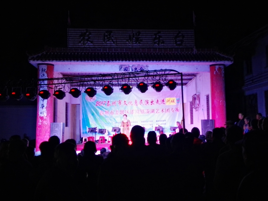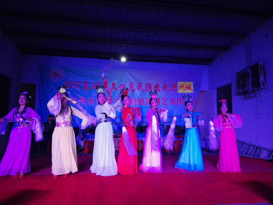10月18日,秋高气爽姜堰区溱潼镇溱湖艺术团应姜堰区溱潼镇洲城村邀请,2017年泰州市文化惠民券专场演出于当晚6点30分,在村百姓大舞台上演。为适应观众不同层次的文化欣赏需求,溱湖艺术团精心策划了14个丰富多彩的文艺节目,随着欢快喜庆的音乐响起,舞蹈《红红火火大中华》拉开了演出序幕,当晚演出不仅有激情奔放的民歌与民舞,而且有耳熟能详的戏曲,淮剧《手捧枝头花香藕》,还缴请当地群众上台表演,最后在歌伴舞《阳光路上》结束晚会,整台演出效果好,弘扬社会正气,倡导诚实守信,气氛热烈,掌声不断,赢得了广大观众的一致好评。当天晚上演出时长120分钟,观众达到400多人,优美而精彩的表演,给村民送去一份丰盛的文化大餐。