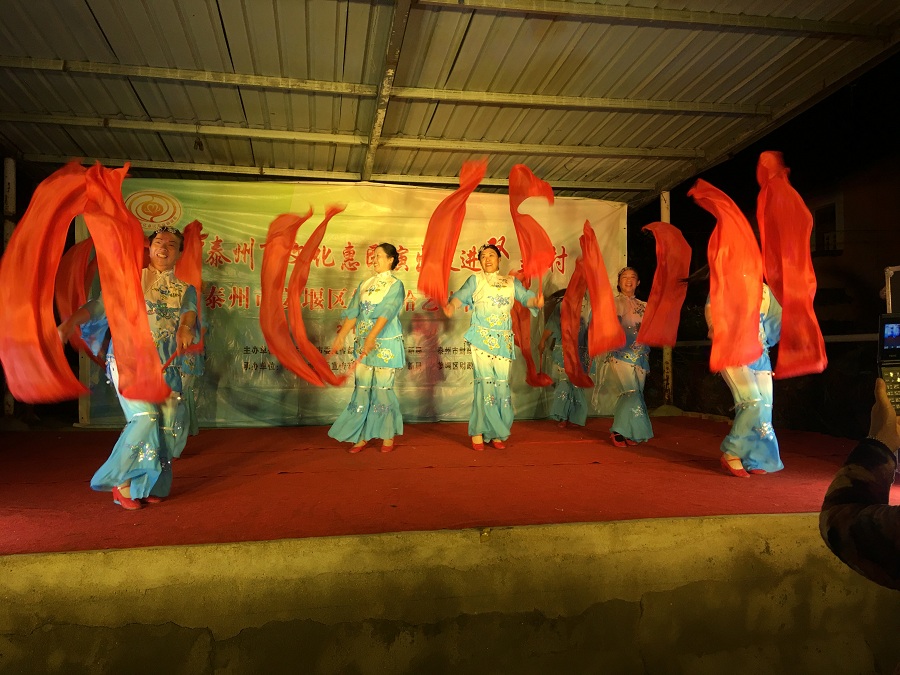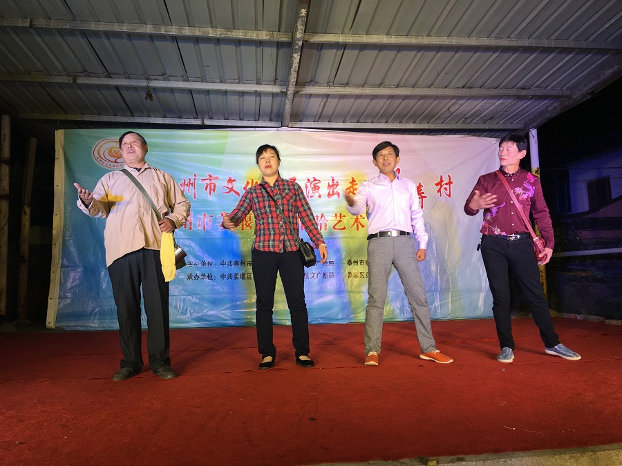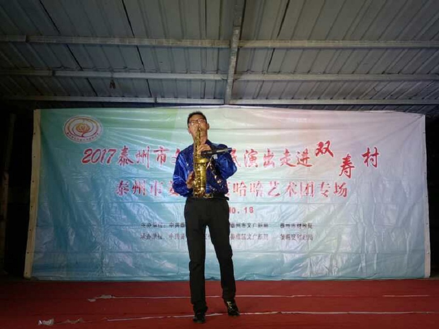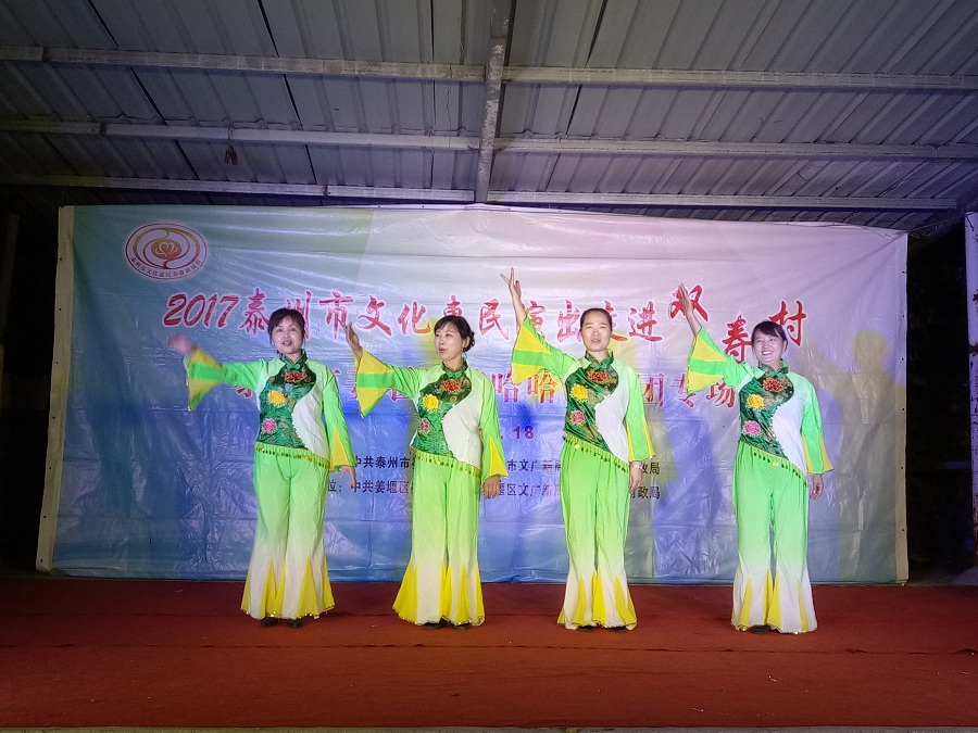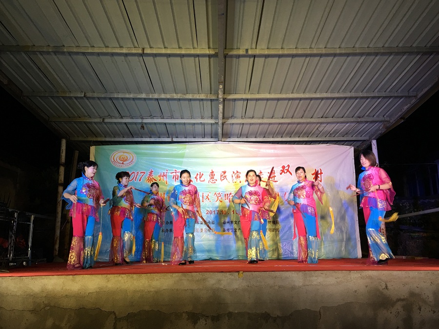 10月18日,姜堰区笑哈哈艺术团文化惠民专场演出走进双寿村。晚上7点演出在双寿村大舞台准时开始,现场表演的节目有舞蹈《红红火火大中华》、莲花落说唱《莲花一打笑哈哈》、方言韵白《路在脚下》《拐过弯来是幸福》萨克斯演奏《北国之春》、表演《回娘家》、天津快板《有话好好说》、相声《趣说泰州话》、表演唱《财政惠民乐农家》、以及独唱等11种形式、12个节目。整台演出时长115分钟,观众约300人左右。节目形式多样、内容丰富,尤其相声、快板、喜剧小品、方言韵白等语言类特色节目赢得了观众的阵阵笑声和掌声,受到村干部、群众的一致好评。