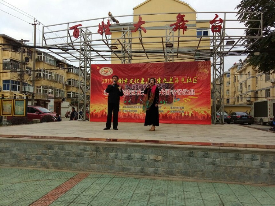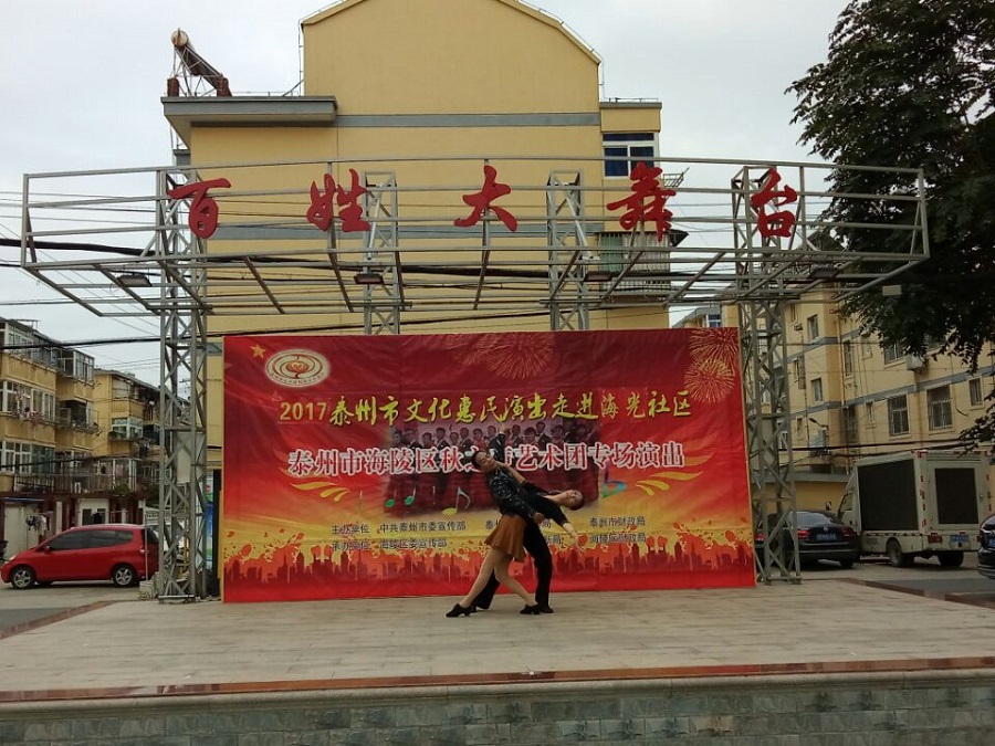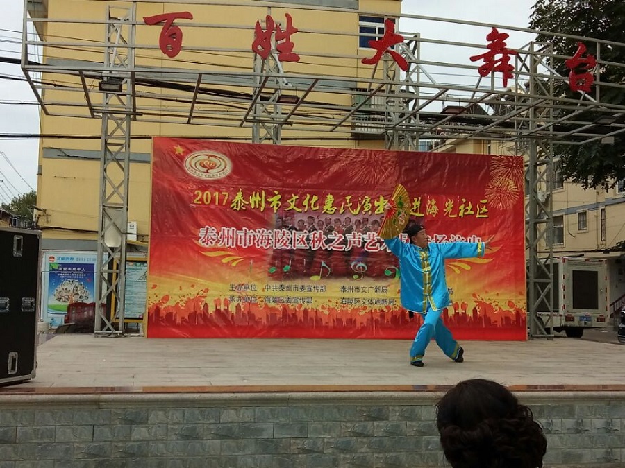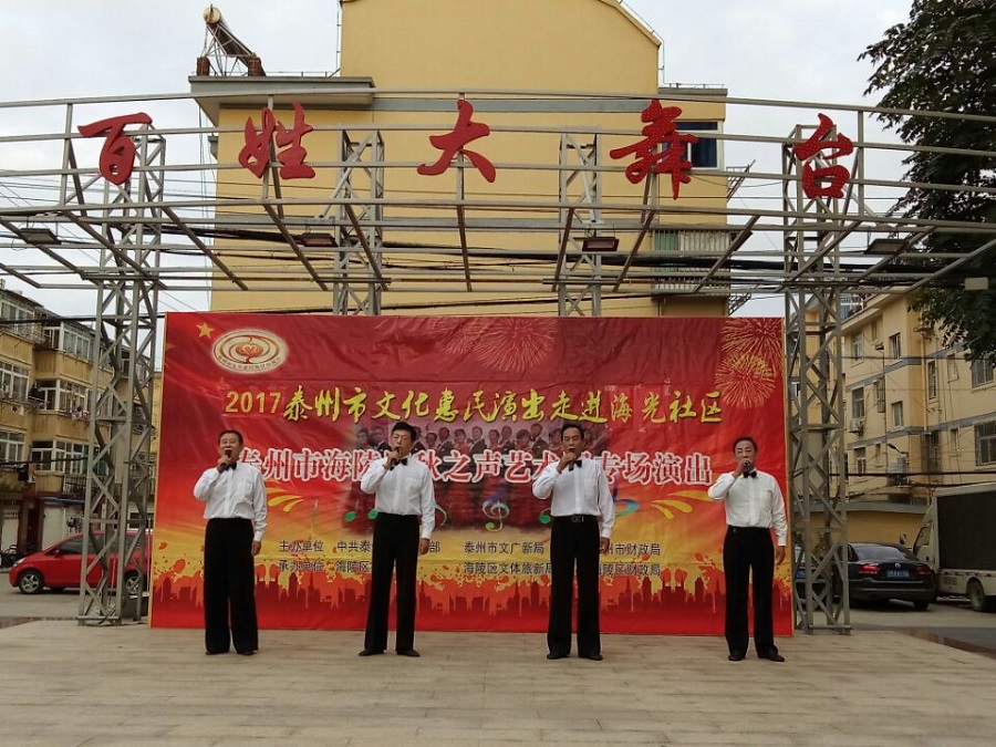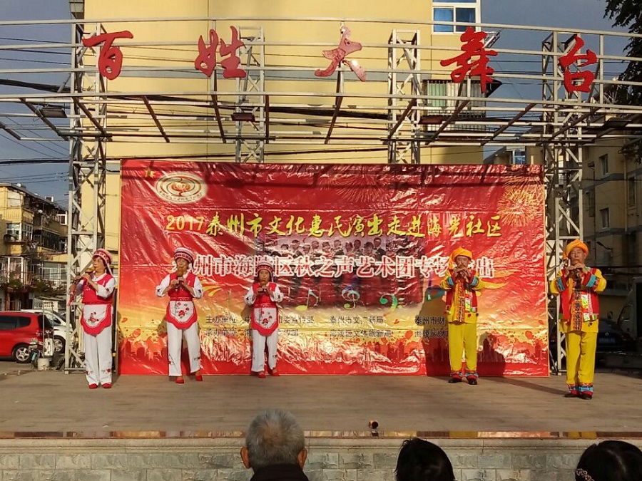 2017年10月20日下午3点30分,泰州市海陵区秋之声艺术团应海陵区城西街道邀请,惠民演出走进海光新村社区。当天下午在海光新村社区内广场演出。下午二点多钟,社区内的观众就陆续不断的到达现场,临近演出时观众已达百拾人,演出节目共有17个,其中午蹈美丽中国梦、走秀远方的思恋、男声四重唱少林少林、京剧梨花颂、前门情思大碗茶等节目的精彩表演让全场掌声不断,把演出推向高潮,当谢幕曲难忘今宵奏响时,观众依依不舍,整场演出给观众留下了良好的印象。