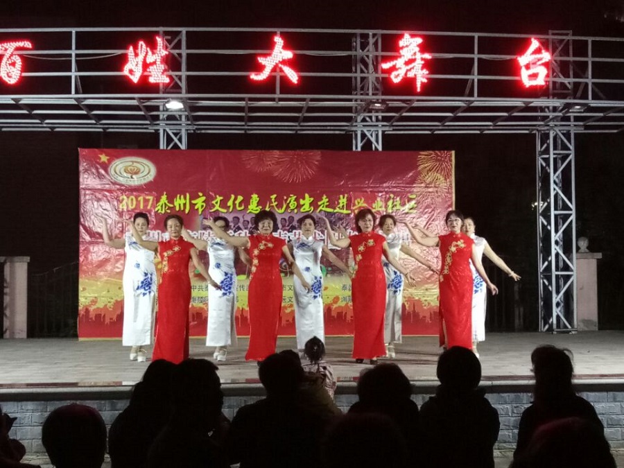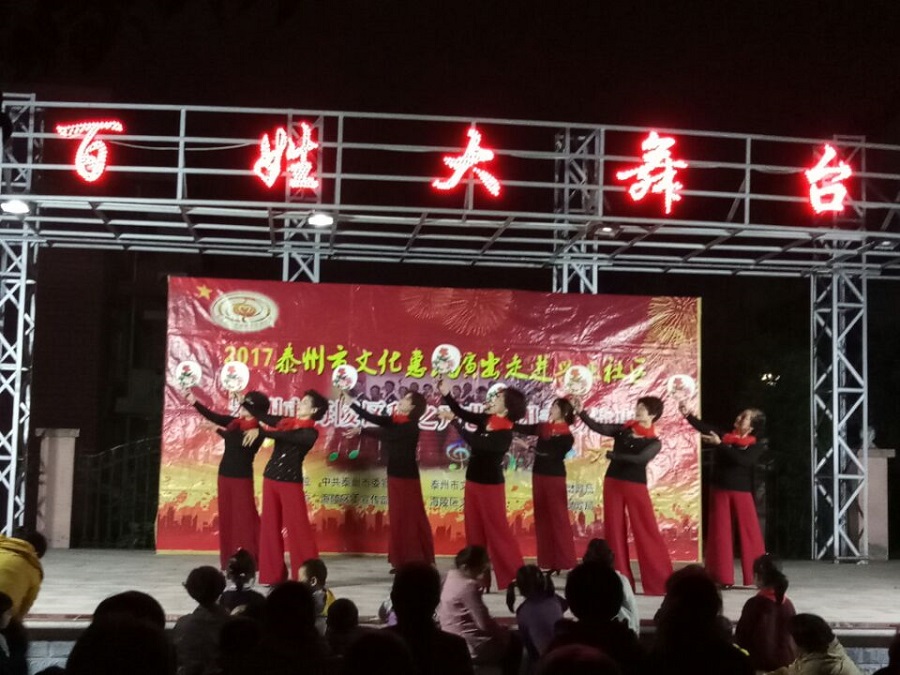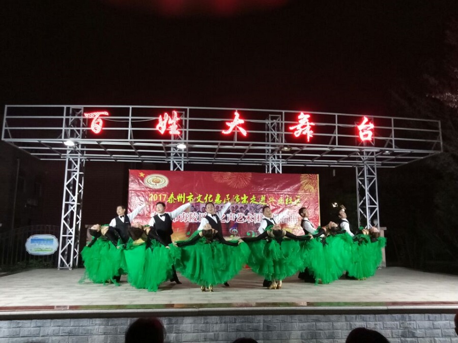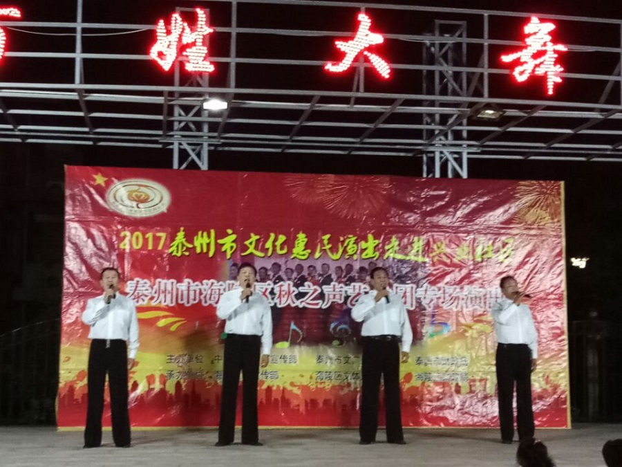 2017年10月20日晚上7点00分,泰州市海陵区秋之声艺术团应泰州海陵区城西街道邀请,惠民演出走进兴业社区。当天晚上7点在兴业社区内广场演出,晚上六点多钟观众就陆续早早来到演出广场,演出开始时观众多达几百号人。演出节目有17个,其中舞蹈美丽中国梦、走秀远方的思恋、男声四重唱少林少林、前门情思大碗茶等节目的精彩表演让全场掌声不断,把演出推向高潮,当谢幕曲难忘今宵奏响时,观众依依不舍,整场演出给观众留下了良好的印象。