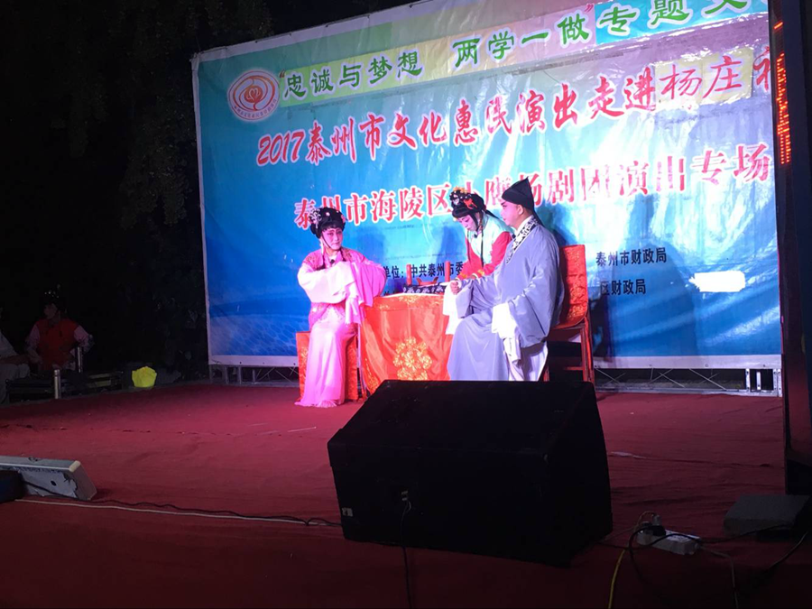 2017泰州市文化惠民演出走进医药高新区凤凰街道杨庄社区,海陵区小鹰扬剧团专场演出,于9月19日晚上在医药高新区凤凰街道杨庄社区百姓大舞台成功举办。本场演出剧目为大型扬剧《分裙记》,此剧剧情跌宕起伏,曲折动人,最终坏人得到了应有的下场,演员们精彩的表演赢得了观众的阵阵掌声。演出很成功!最后应观众要求又加演了扬剧折子戏。感谢社区领导提供全方位的服务!