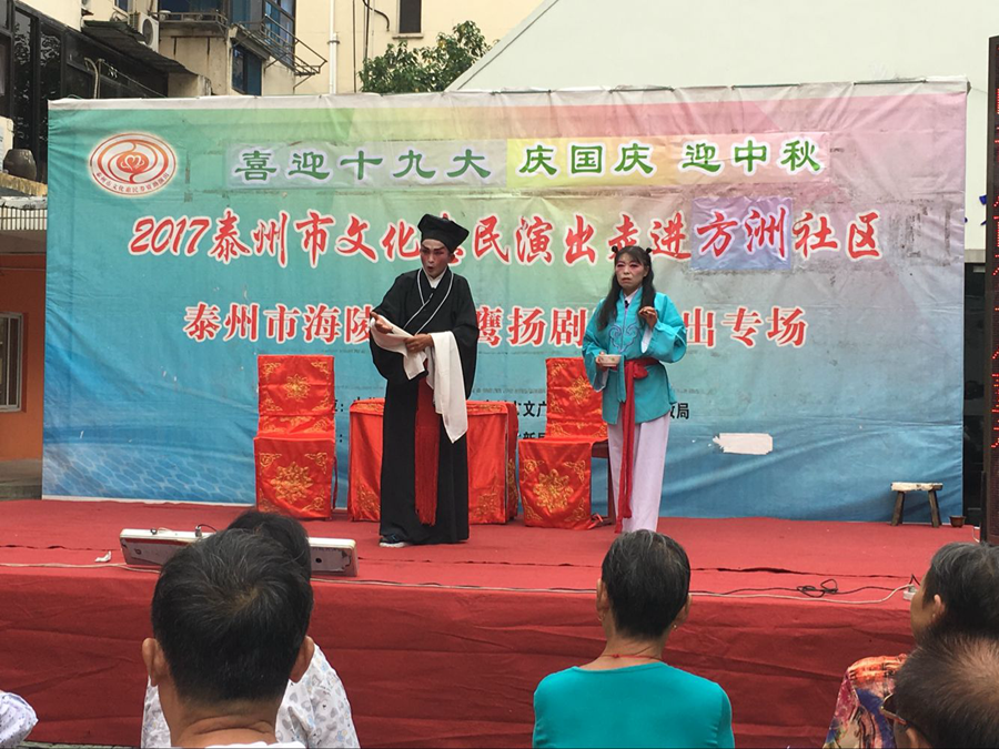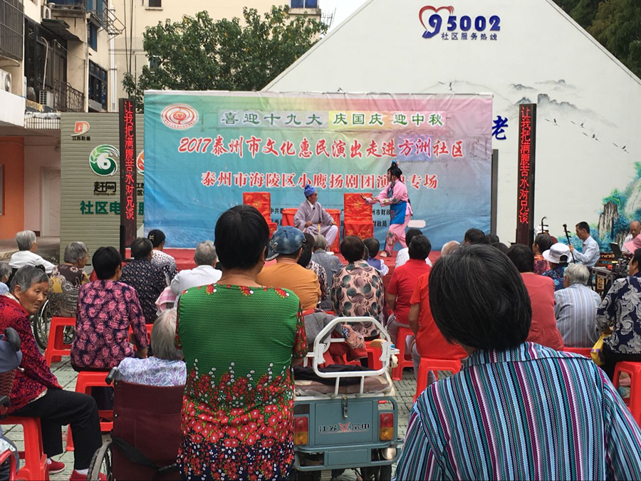 2017泰州市文化惠民演出走进海陵区城中街道方洲社区,海陵区小鹰扬剧团专场演出,2017年9月21日下午在海陵区城中街道方洲社区海阳居家养老中心院内广场成功举办。本场演出剧目为扬剧《小媳妇回娘家》及《安寿宝卖身》选段,演员们精彩的表演博得了观众的阵阵掌声。演出很成功!感谢社区领导提供全方位的服务!