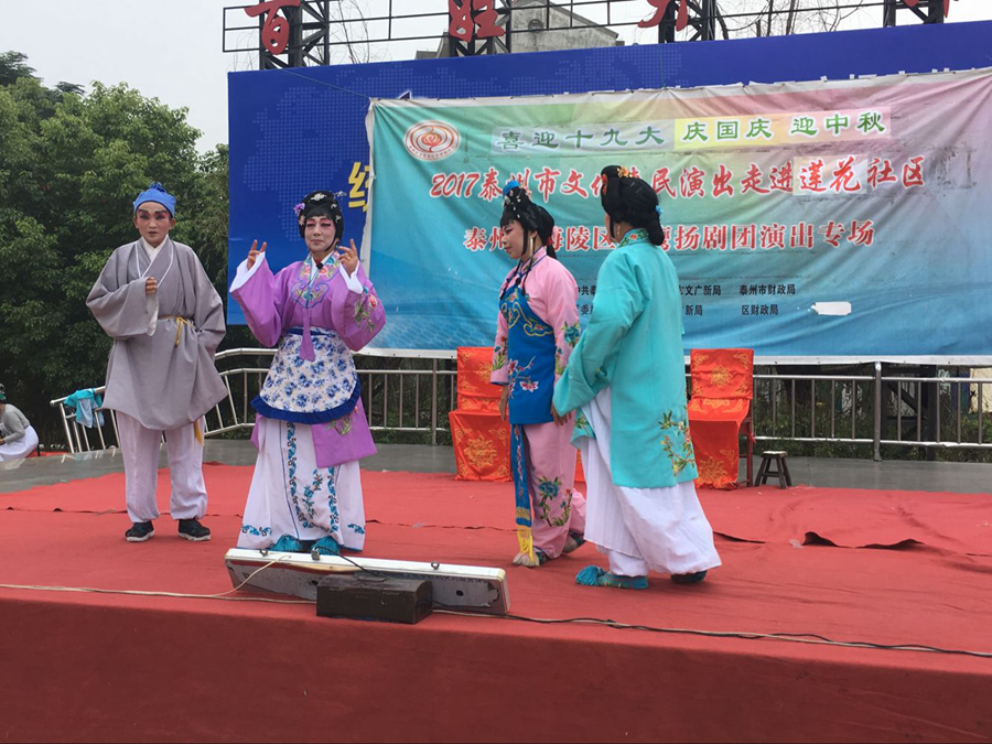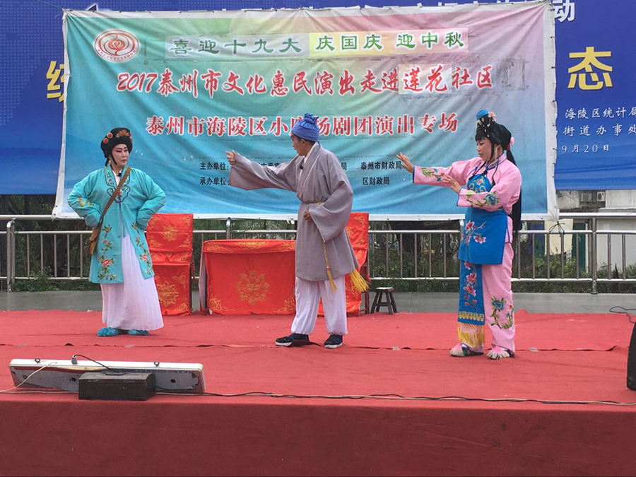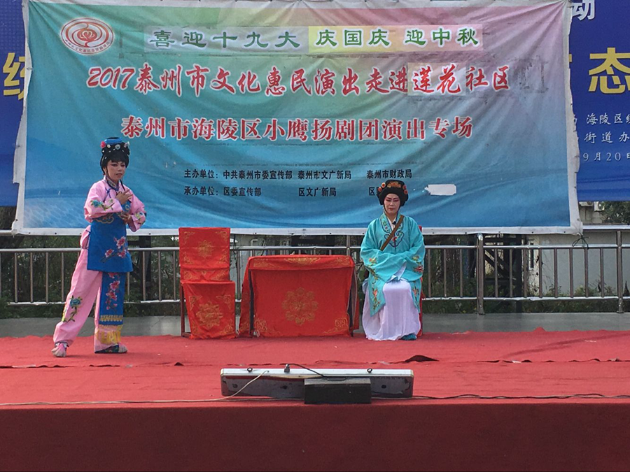 2017泰州市文化惠民演出走进海陵区城南街道莲花社区,海陵区小鹰扬剧团专场演出,2017年9月25日下午在海陵区城南街道莲花社区百姓大舞台成功举办。本场演出演出剧目为现代滑稽扬剧《小媳妇回娘家》以及传统扬剧《安寿宝》卖身选段,演员们精彩的表演博得了观众的阵阵掌声。演出很成功!感谢社区领导提供全方位的服务!