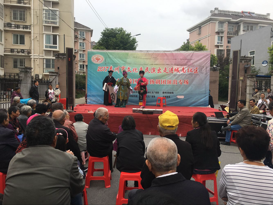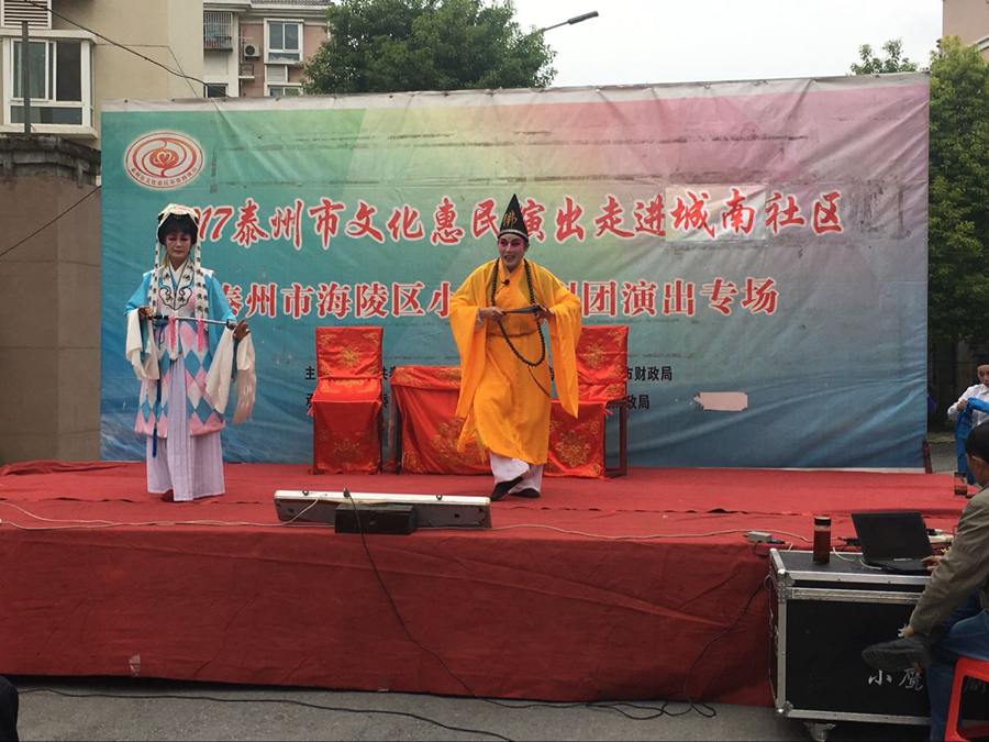 2017泰州市文化惠民演出走进城南社区,海陵区小鹰扬剧团专场演出,于2017年10月3日下午在泰州医药高新区明珠街道城南社区成功举办。本场演出演出剧目为扬剧折子戏《探寒窑》和《僧尼下山》。扬剧《僧尼下山》是扬剧表演艺术家杨国斌和高派传人祝荣娟老师合作演出的拿手戏,至今是百听不厌,演员们精彩的表演博得了观众的阵阵掌声。小品方言拔牙让观众捧腹大笑,演出很成功!感谢社区领导提供全方位的服务!