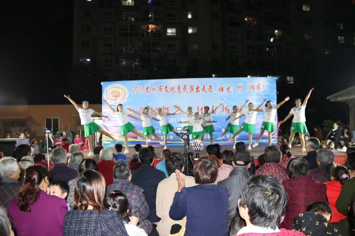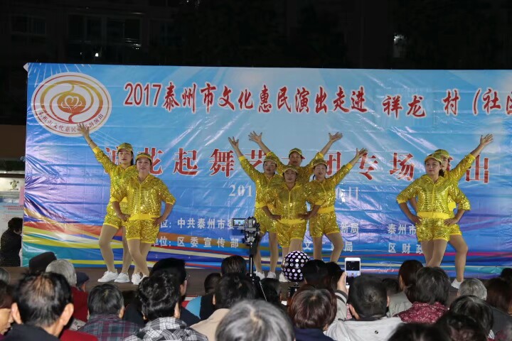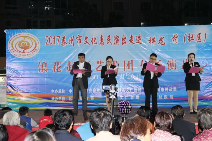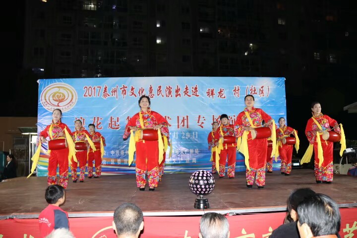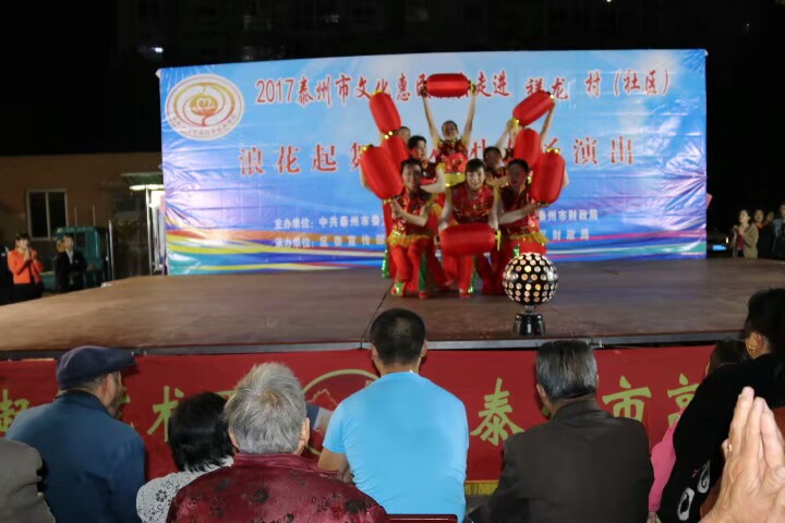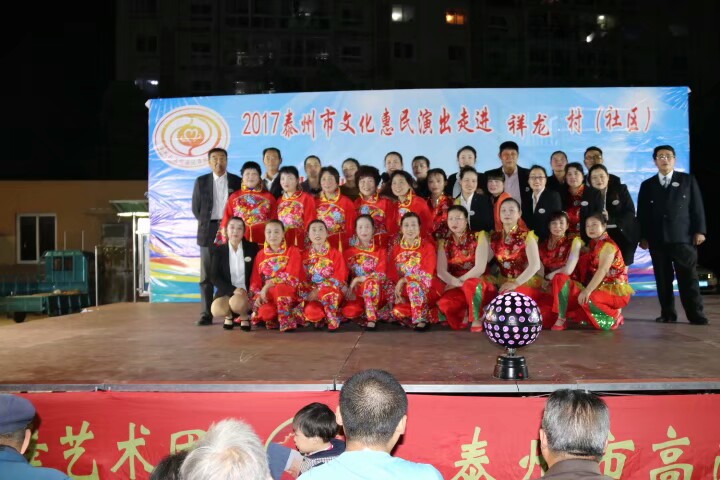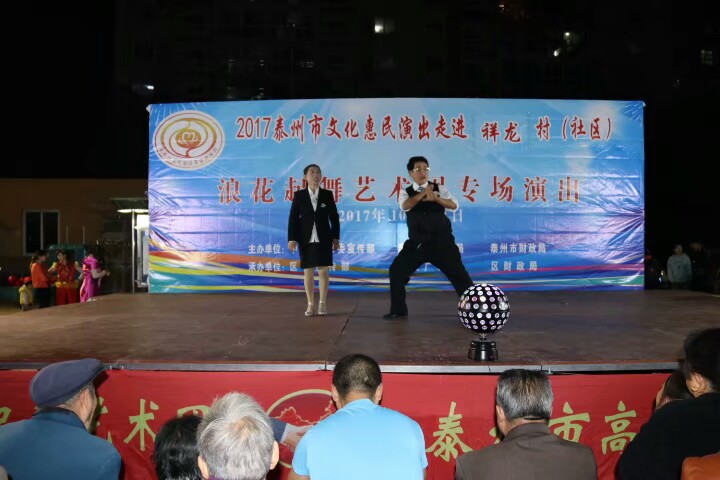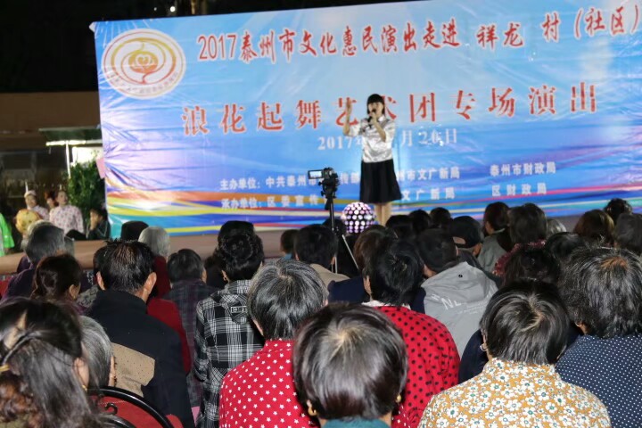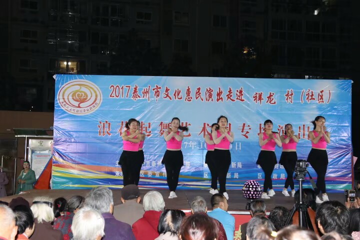 泰州医药高新区浪花起舞艺术团于2017年10月20日晚走进明珠街道祥龙社区进行文化惠民演出。演出在欢天喜地的锣鼓声中拉开了帷幕,采用群众喜闻乐见的表演方式进行。舞蹈《张灯结彩》既喜庆又欢快;快板《说安全》提高了居民的安全意识;健身操舞《踩云追月》、说唱表演《四大嫂夸健康》带动了居民的健身热情;越剧、黄梅戏更是满足了戏曲爱好者的口味,让居民们听得畅酣淋漓。形式多样、内容丰富的节目吸引了社区近四百名群众前来观看,赢得了观众们的阵阵掌声和笑声,受到广大干群的一致好评!