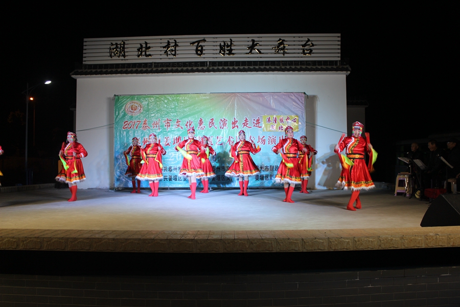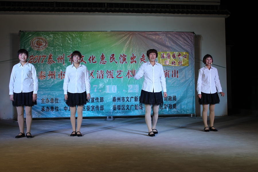 十月二十四曰,姜堰区清瓴艺术团恵民演出走进溱潼镇中心,演出在湖北村大舞台举行.演出有歌舞,小戏剧,情景剧,小品.表演唱等多种形式.演出过程中观众掌声不断,热情高涨.整台演出近两个小时.受到了大家的一致好评.