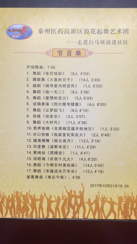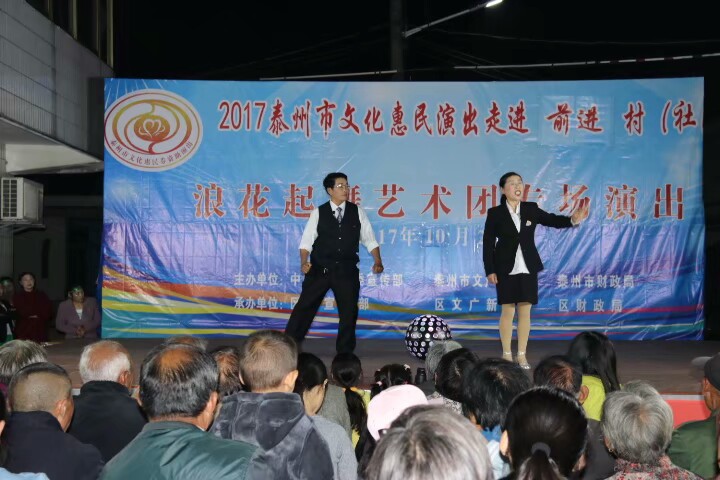 泰州医药高新区浪花起舞艺术团于2017年10月21日晚19:00走进前进社区进行文化惠民演出。为了适应观众不同层次的文化欣赏需求,我团精心策划了17个丰富多彩的文艺节目,随着欢快喜庆的音乐响起,舞蹈《张灯结彩》拉开了序幕,节目有舞蹈、快板、说唱表演、越剧、黄梅戏等形式多样、内容丰富的节目吸引了社区近四百名群众前来观看,给我们演员献花!演出赢得了观众们的阵阵掌声和笑声,受到广大干群的一致好评!