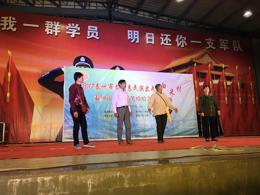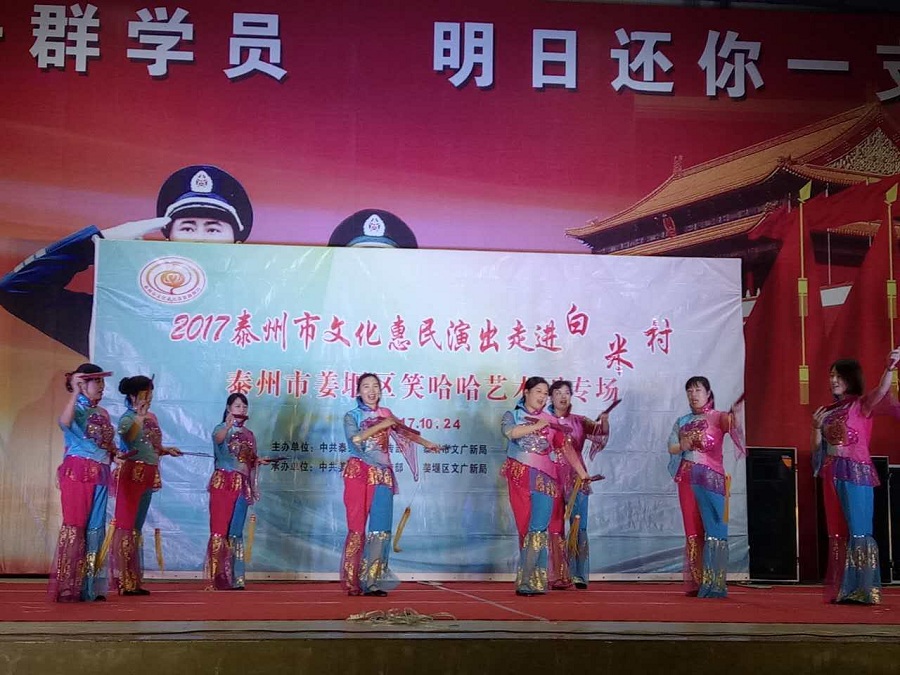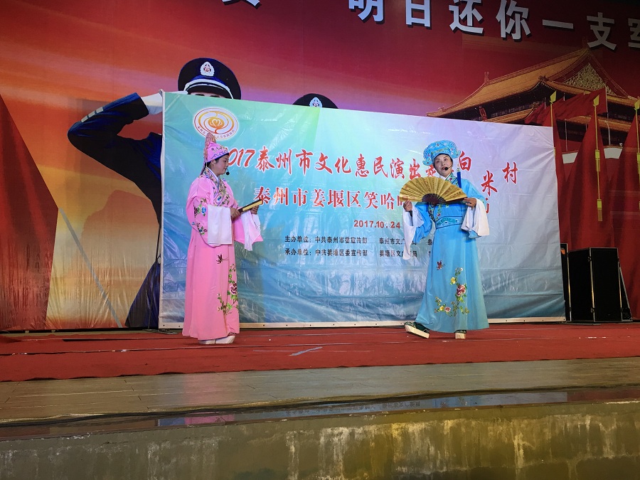 10月24日,姜堰区笑哈哈艺术团文化惠民专场演出走进白米村。晚上7点演出在白米村孔园学校准时开始,现场表演的节目有舞蹈《红红火火大中华》、莲花落说唱《莲花一打笑哈哈》、小品《二媳争婆》方言韵白《拐过弯来是幸福》相声《趣说姜堰话》萨克斯演奏《北国之春》、表演《回娘家》、天津快板《有话好好说》、表演唱《财政惠民乐农家》、以及独唱等11种形式、12个节目。整台演出时长120分钟,观众约900人左右。节目形式多样、内容丰富,尤其相声、快板、喜剧小品、方言韵白等语言类特色节目赢得了观众的阵阵笑声和掌声,受到村干部、群众的一致好评。