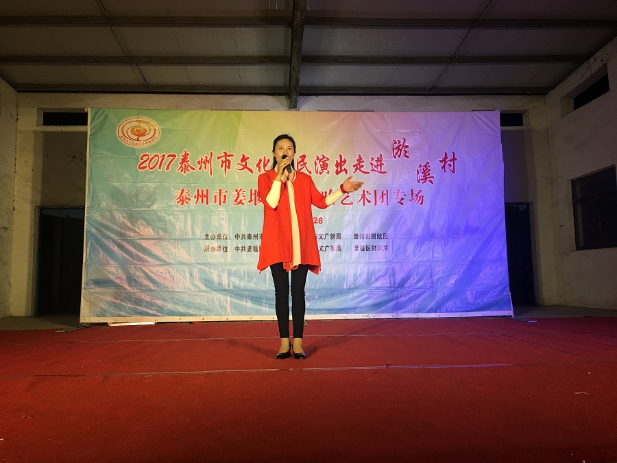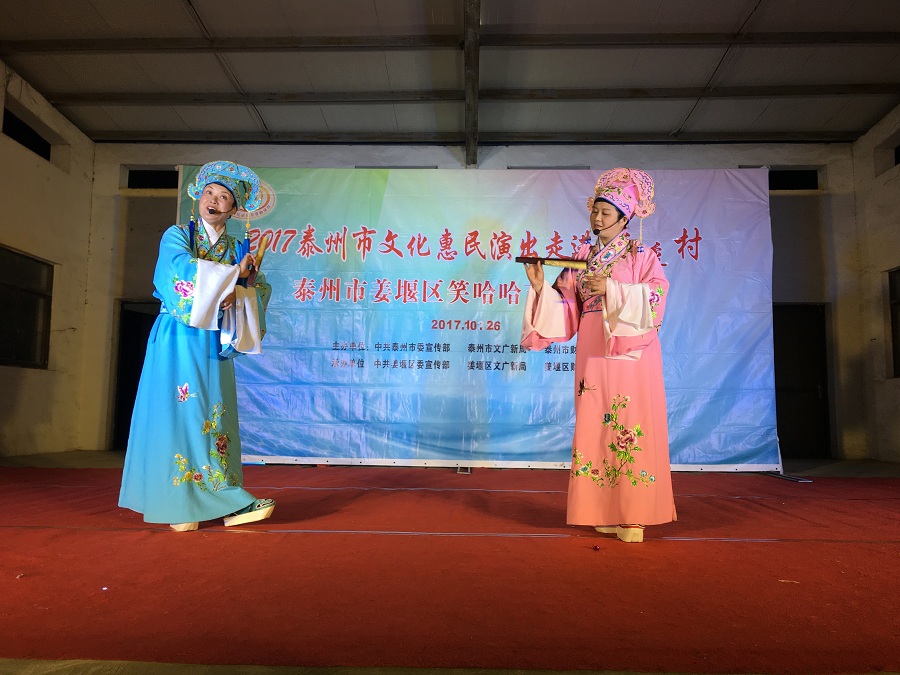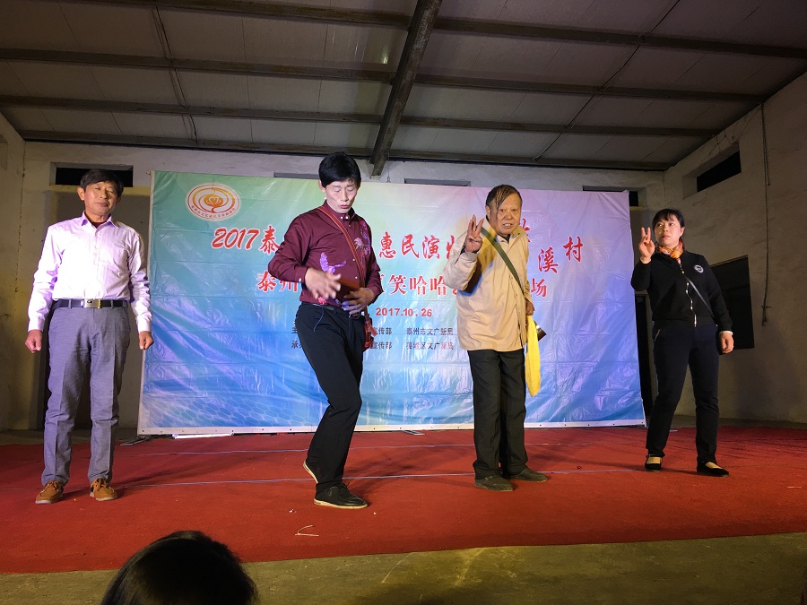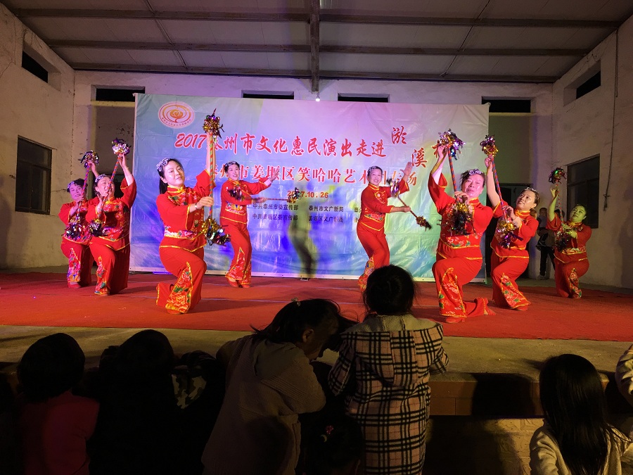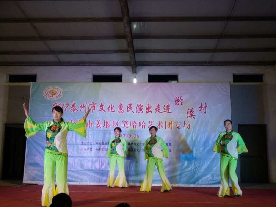 10月26日,姜堰区笑哈哈艺术团文化惠民专场演出走进淤溪村。晚上7点演出在淤溪村大舞台准时开始,现场表演的节目有舞蹈《红红火火大中华》、莲花落说唱《莲花一打笑哈哈》、方言韵白《路在脚下》、《拐过弯来是幸福》相声《趣说姜堰话》萨克斯演奏《北国之春》、表演《回娘家》、天津快板《有话好好说》、表演唱《财政惠民乐农家》、以及独唱等11种形式、12个节目。整台演出时长120分钟,观众约800人左右。节目形式多样、内容丰富,尤其相声、快板、喜剧小品、方言韵白等语言类特色节目赢得了观众的阵阵笑声和掌声,受到村干部、群众的一致好评。