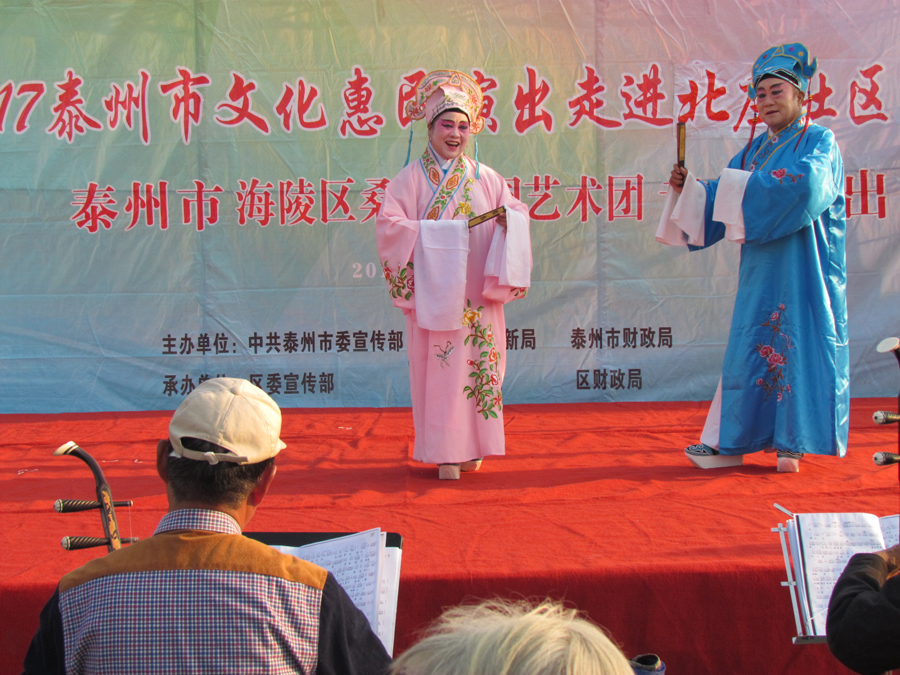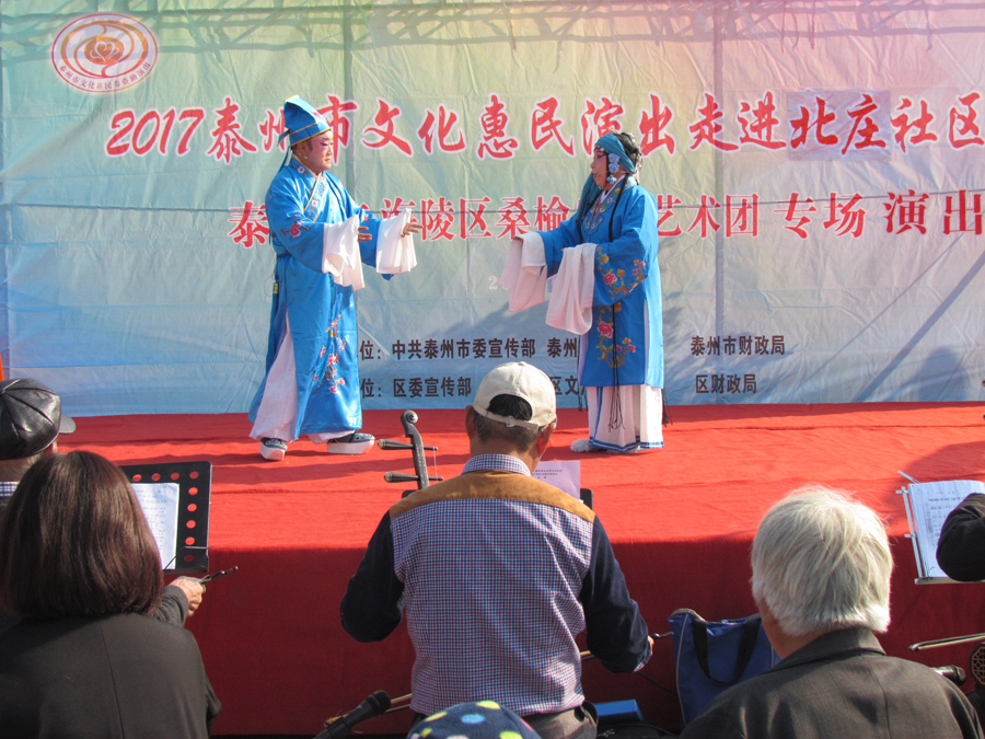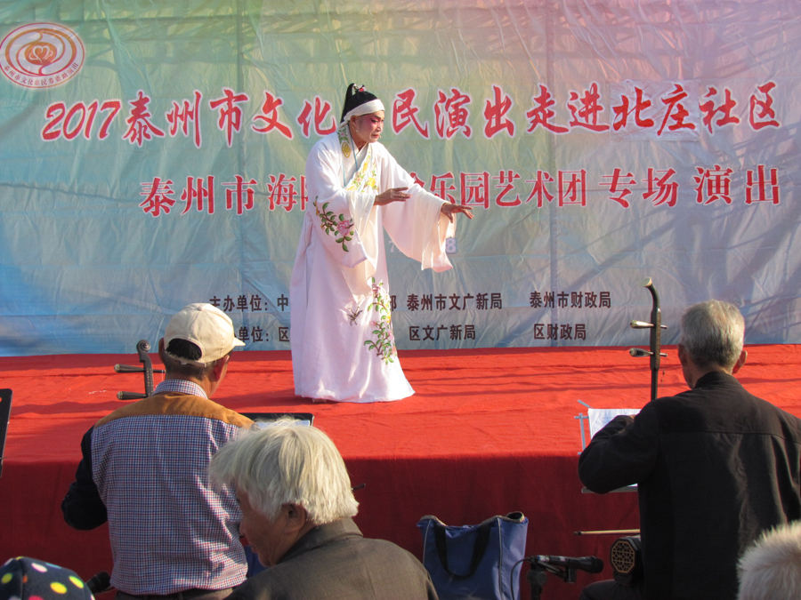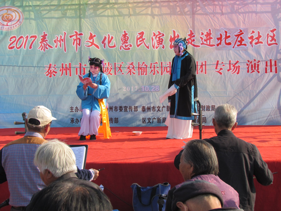 2017年10月28日下午,多云天气,秋高气爽,气候宜人。在新通扬运河南岸的苏陈镇北庄村的广场上,海陵区桑榆乐园艺术团为北庄村的父老乡亲们送去了一台精彩的戏曲专场演出,有淮剧《赵五娘》折子戏选段“别家”,有扬剧《安寿宝卖身》折子戏选段“破 庙失子”以及扬淮折子戏选段“十八相送”等,近200名群众对每个节目都报以热烈的掌声,有的节目演出后,群众还要求再来一个,艺术团都一一满足群众的需求。精彩的演出在苏陈镇北端,新通扬运河畔形成了一道亮丽的风景线。