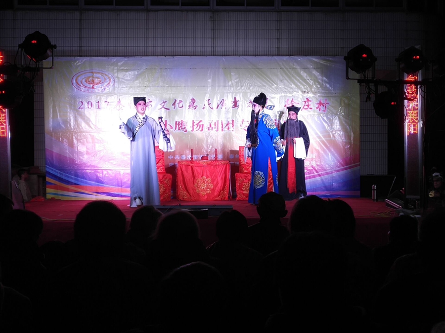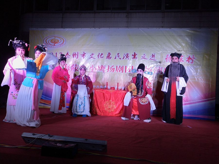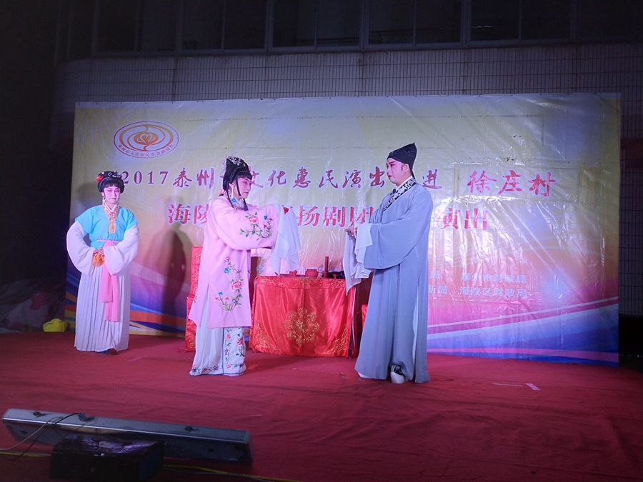 泰州市2017文化惠民演出走进海陵区苏陈镇徐庄村,海陵区小鹰扬剧团专场演出,2017年10月29日晚上在徐庄村七组广场成功举办。本次演出剧目为传统扬剧《珍珠塔》,剧中姑妈妈的势利,嫌贫爱富的举动受到观众的谴责,剧情大义就是告诉世人,人穷不能穷一辈子,三十年河东转河西,姑妈嫌她侄儿方卿穷,上门来投亲,都不相认,并且说了好多刺激他的话,说他没有高官做,方卿后来励志苦读三年书,考举了头名状元,唱道情羞辱他的姑妈,让她改掉势利的坏习惯。演员们精彩的演出,博得了观众的阵阵掌声。演出很成功!感谢社区领导提供全方位的服务!成功举办。