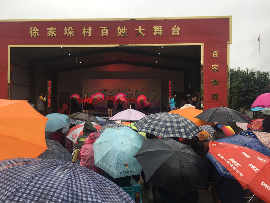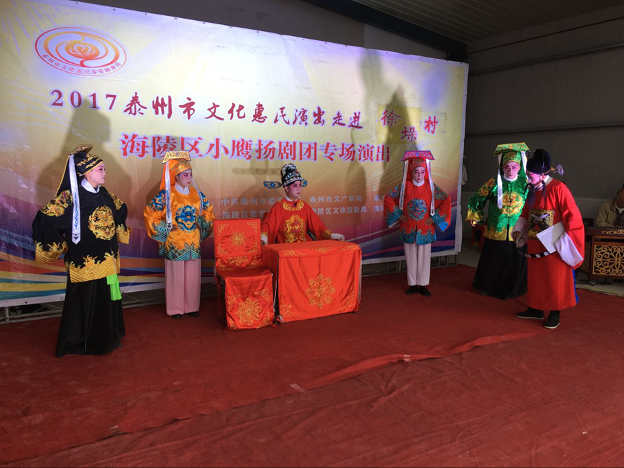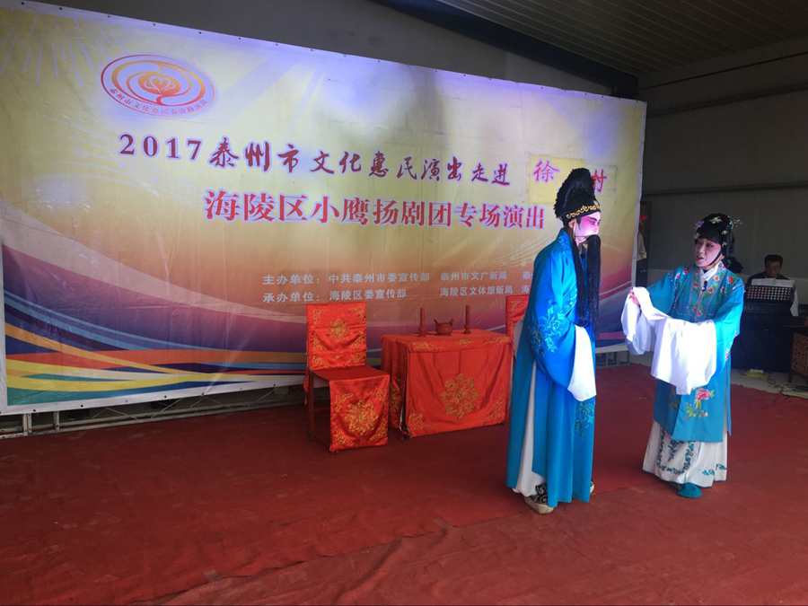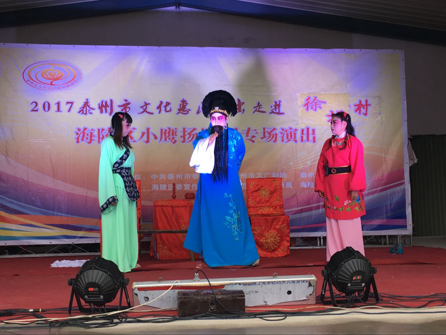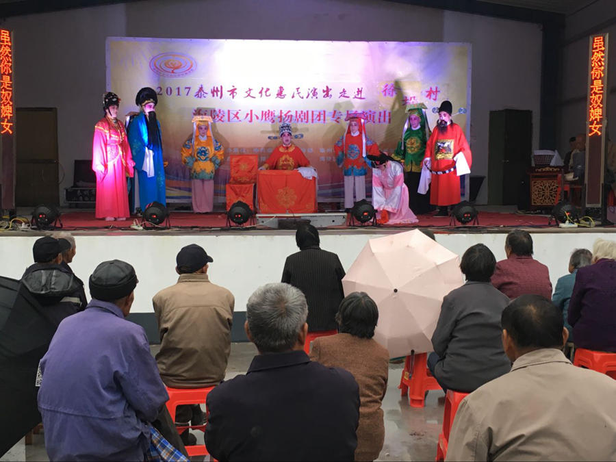 2017泰州市文化惠民演出走进姜堰区华港镇徐家垛村,海陵区小鹰扬剧团专场演出,2017年10月5日下午在姜堰区华港镇徐家垛村百姓大舞台成功举办。本场演出剧目为大型扬剧《分裙记》,此剧剧情跌宕起伏,曲折动人,外面虽然下着大雨但是丝毫没有减弱村民们看戏的热情,村领导为保证老百姓安心看戏,搭起了帐篷让大家很感动。演员们精彩的表演唱博得了观众的阵阵掌声。演出很成功!最后应观众要求又加演了安寿宝卖身选段。感谢村领导提供全方位的服务!