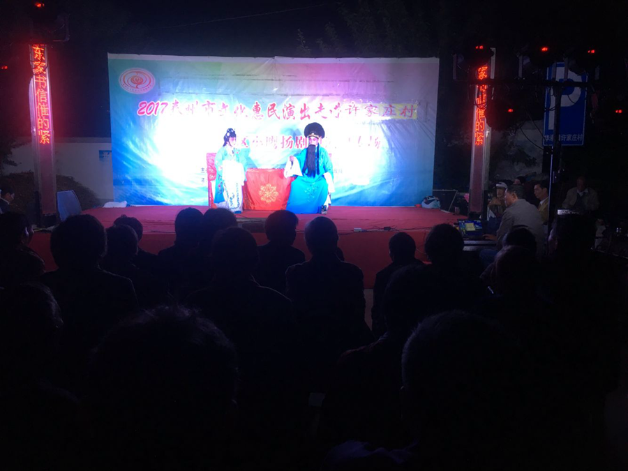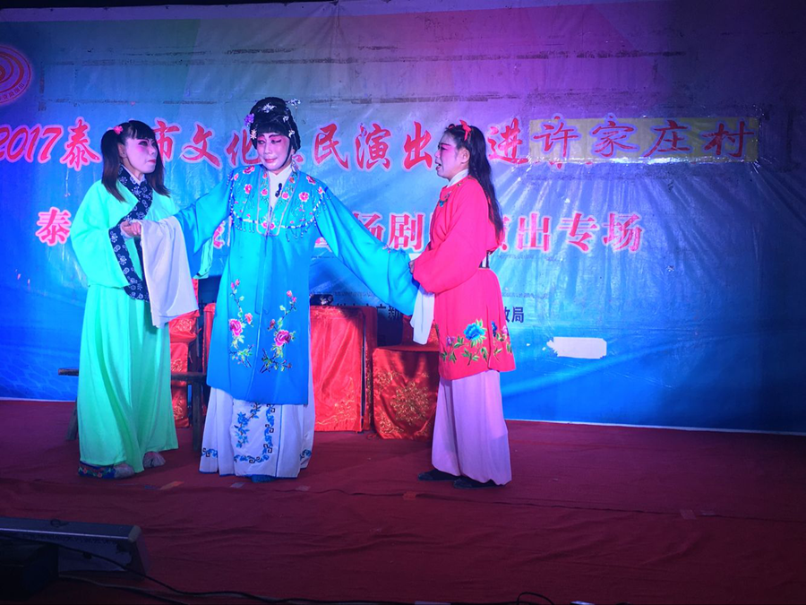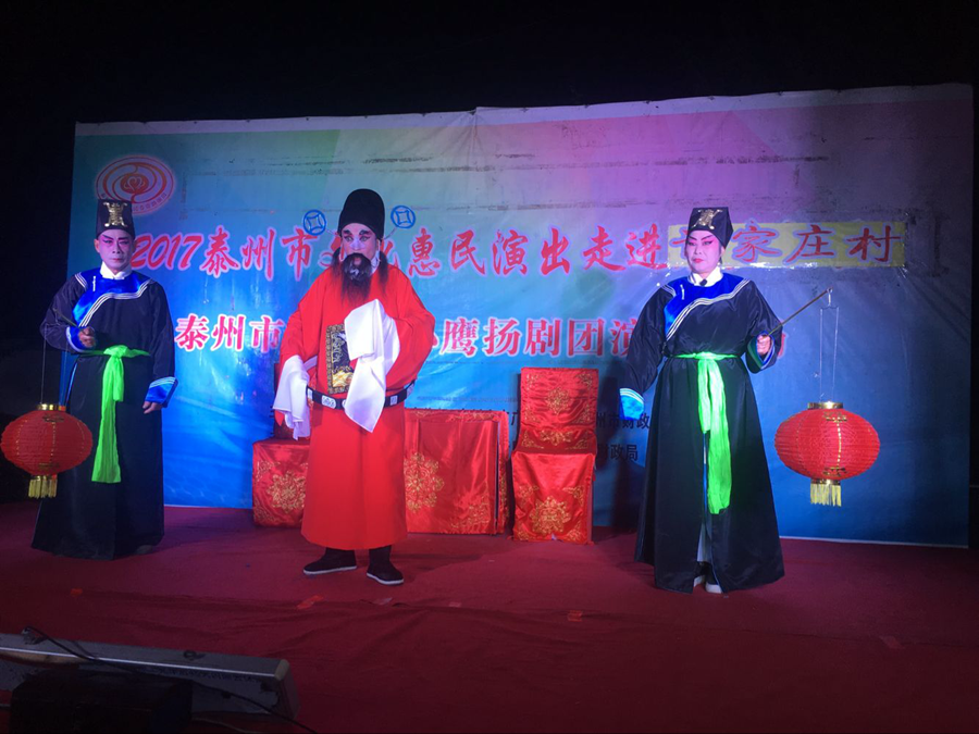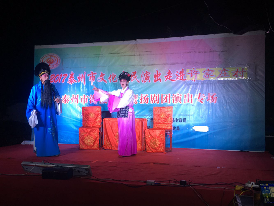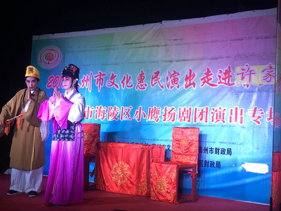 2017泰州市文化惠民演出走进姜堰区华港镇许家庄村,海陵区小鹰扬剧团专场演出,2017年10月6日晚上在姜堰区华港镇许家庄村百姓大舞台成功举办。本场演出剧目为大型古装扬剧《分裙记》上下集,此剧剧情跌宕起伏,曲折动人,最终坏人得到了应有的下场,演员们精彩的表演唱博得了观众的阵阵掌声。演出很成功!