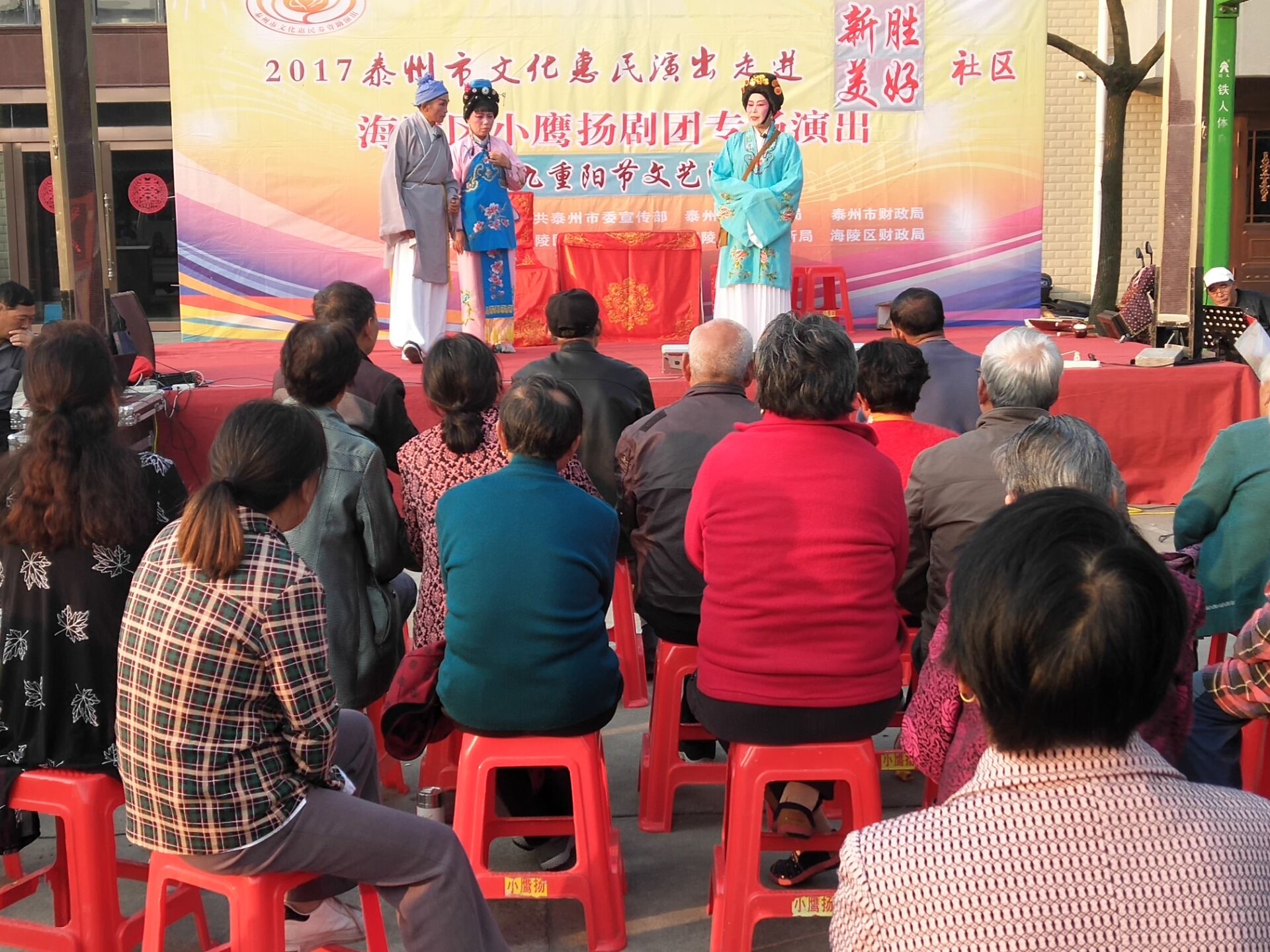 2017泰州市文化惠民演出走进海陵区城南街道新胜、美好社区,海陵区小鹰扬剧团专场演出,2017年10月27日下午在海陵区城南街道新胜社区百姓大舞台成功举办。本次活动演出剧目为扬剧折子戏《安寿宝卖身》-卖身选段、现代滑稽扬剧《小媳妇回娘家》。经典的扬剧折子戏博得了观众的阵阵掌声。演出结束应观众要求又加演了《断太后》选段-恨刘妃。演出很成功!感谢社区领导提供全方位的服务!