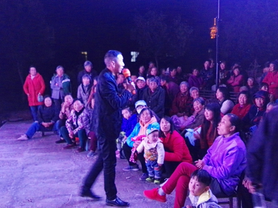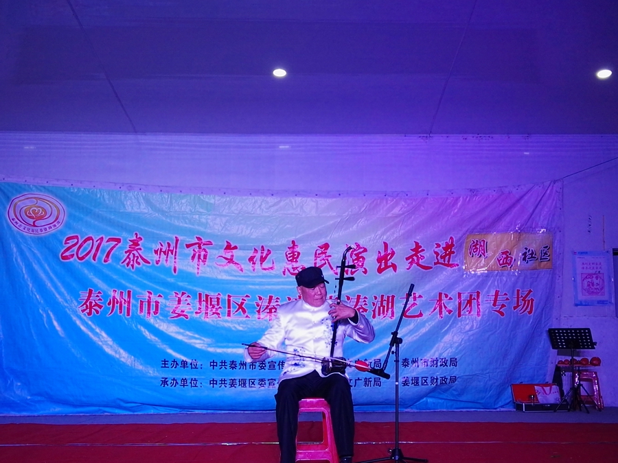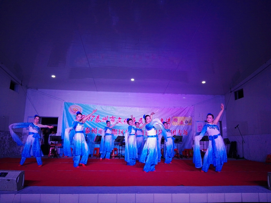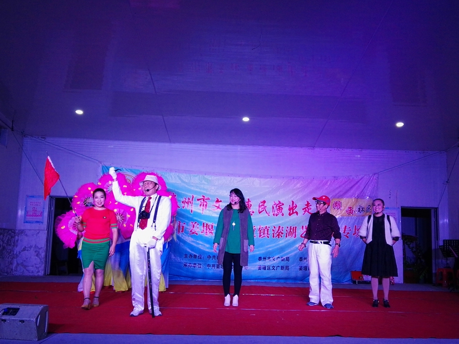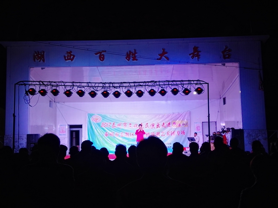 10月30日,秋高气爽姜堰区溱潼镇溱湖艺术团受溱潼镇文化站邀请,2017年泰州市文化惠民券专场演出于当天晚上6点30分,在湖西社区百姓大舞台上演。为适应观众不同层次的文化欣赏需求,溱湖艺术团精心策划了14个丰富多彩的文艺节目,随着悠扬的音乐响起,舞蹈《古镇秀溱湖美》拉开了演出序幕,当晚演出不仅有激情奔放的民歌与民舞,而且有耳熟能详的戏曲,淮剧《手捧枝头花香藕》,最后在歌伴舞《阳光路上》结束演出,整台演出效果好,弘扬社会正气,倡导诚实守信,气氛热烈,掌声不断,赢得了广大观众的一致好评。当天晚上演出观众太热情了,不得不加演节目,时长120分钟,观众达到500多人,当天晚上虽然天气降温,观众人数多,我们演员认真演出,优美而精彩的表演,给居民送去一份丰盛的文化大餐。