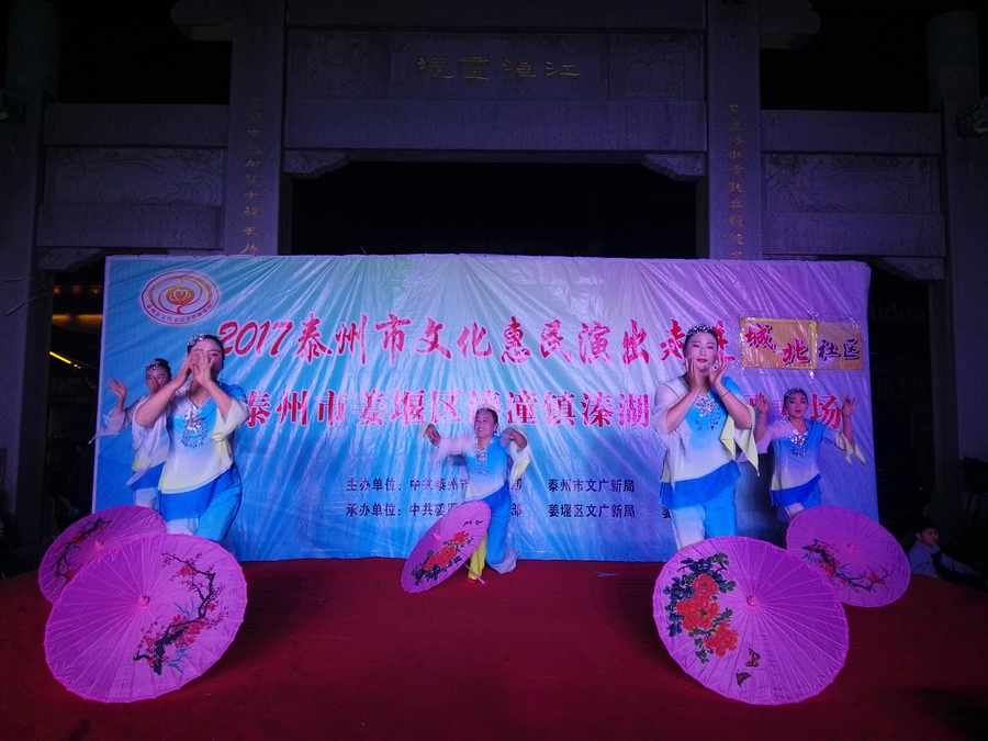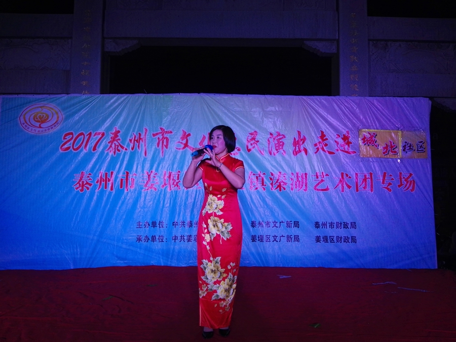11月2日,秋高气爽姜堰区溱潼镇溱湖艺术团受溱潼镇文化站邀请,2017年泰州市文化惠民券专场演出于当天晚上6点30分,在钟楼广场上演。为适应观众不同层次的文化欣赏需求,溱湖艺术团精心策划了14个丰富多彩的文艺节目,随着悠扬的音乐响起,舞蹈《古镇秀溱湖美》拉开了演出序幕,当晚演出不仅有激情奔放的民歌与民舞,而且有耳熟能详的戏曲,淮剧《手捧枝头花香藕》,最后在歌伴舞《阳光路上》结束演出,整台演出效果好,弘扬社会正气,倡导诚实守信,气氛热烈,掌声不断,赢得了广大观众的一致好评。当天晚上演出观众太热情了,不得不加演节目,时长120分钟,观众达到600多人,当天晚上虽然天气降温,观众人数多,我们演员认真演出,优美而精彩的表演,给居民送去一份丰盛的文化大餐。