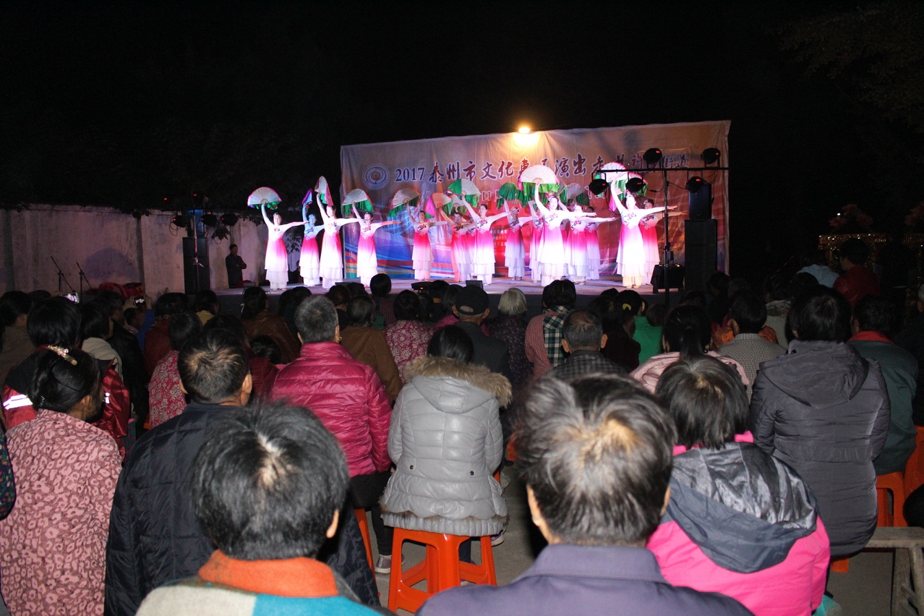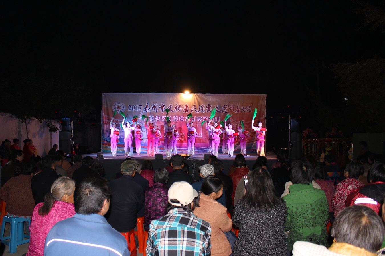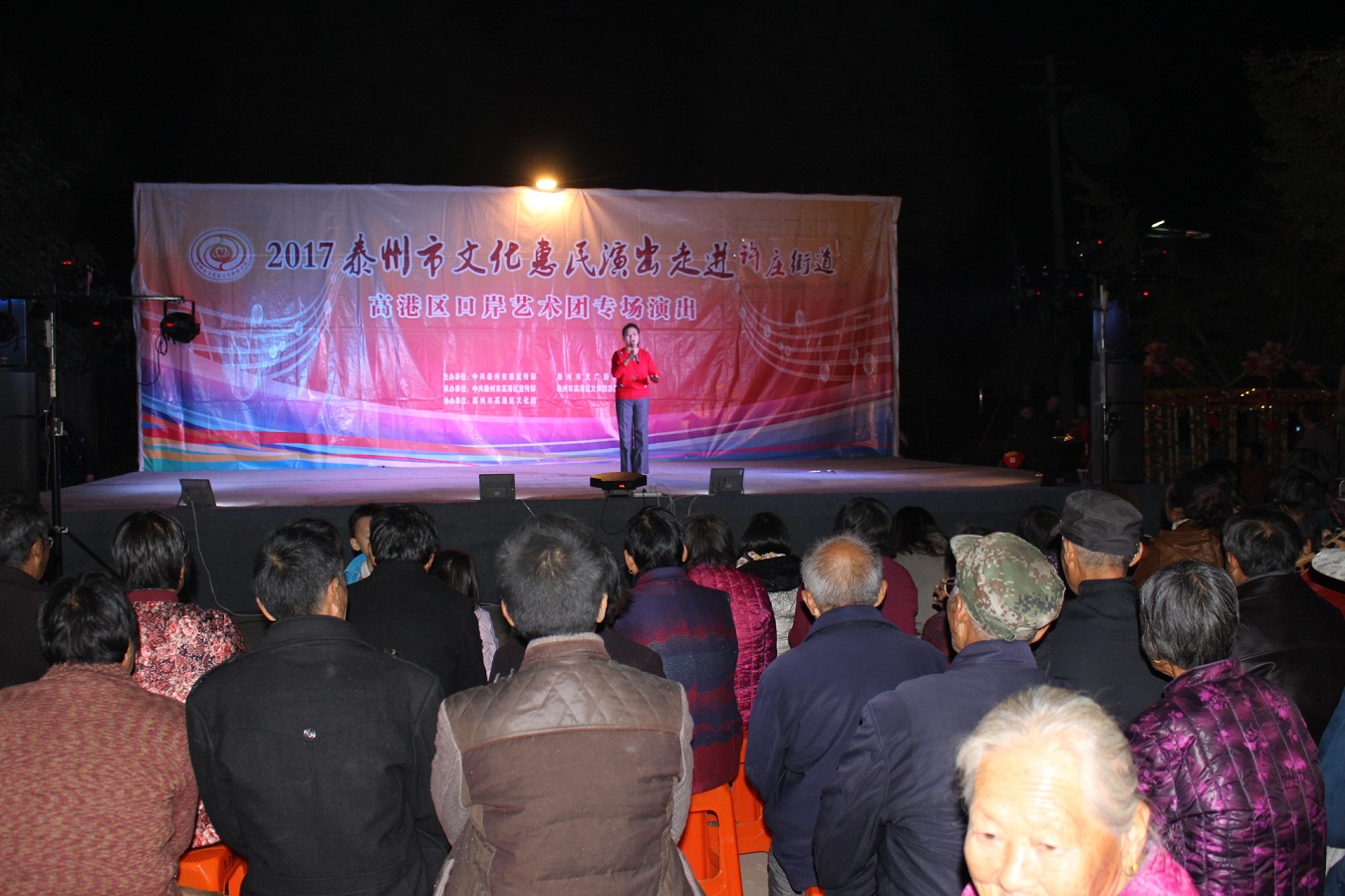 11月1日,社区大广播播放:“好消息!好消息!今天晚上七点钟,口岸艺术团来我们赵王惠民演出,欢迎广大市民到社区广场前来观摩。”消息播出后,大家纷纷转告,晚上,六点半,演出现场就座满了观看的人群。
